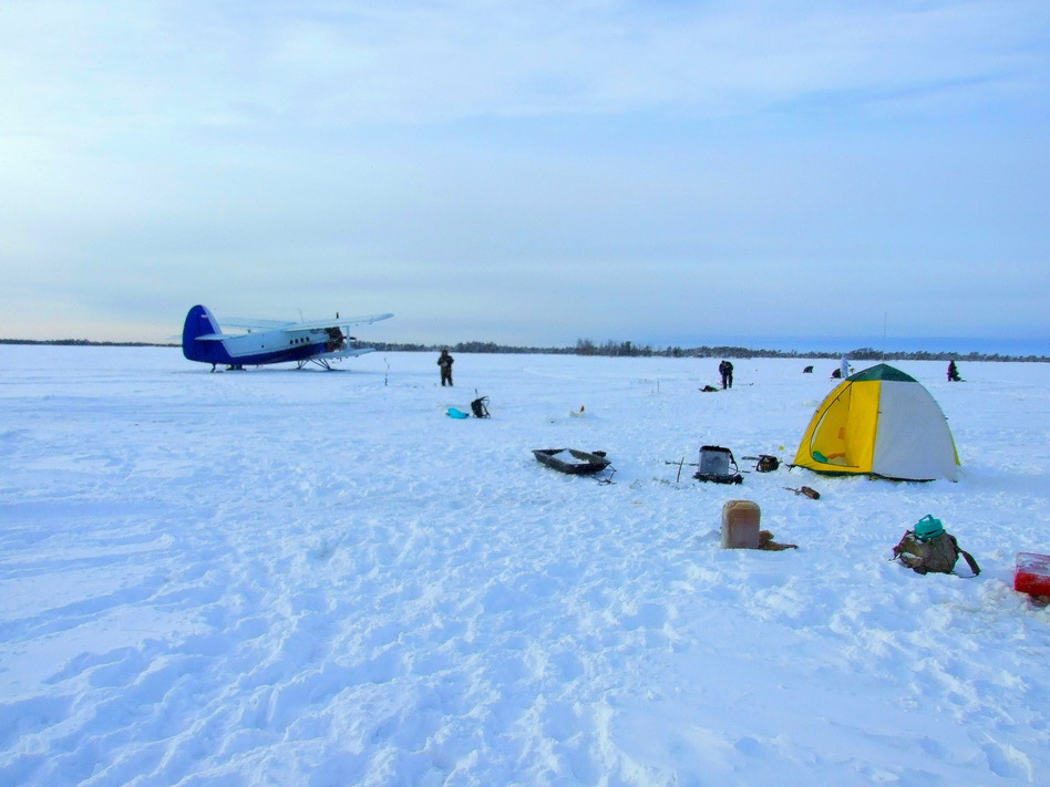 посадка на лед, таежное озеро, тут же пробурили лунки,