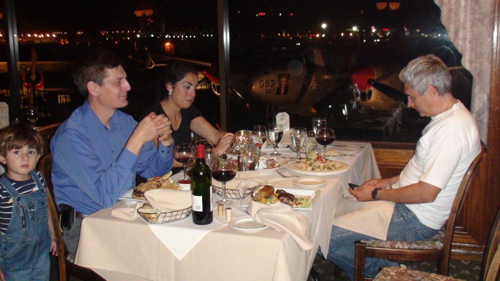 Вечер закончили ужином в авиационном ресторане “Proud Bird” прямо под глиссадой Лос-Анжелесского международного аэропорта. Очень интересное заведение: большие залы, увешанные историческими фотографиями летчиков и самолетов, на огромной парковке и заднем дворике десятка полтора старых самолетов – и при всем этом вполне приличная кухня. Могу смело рекомендовать к посещению! Находится на Aviation Blvd, 11022. Это мы накануне ужинаем там с моим знакомым - Президентом фонда друзей авиации Ником Ракконеном