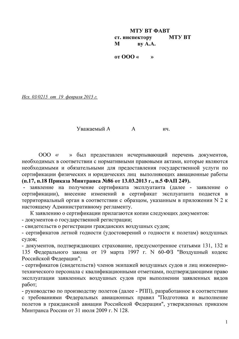 Вопрос к МТУ о составе документов на сертификацию АР