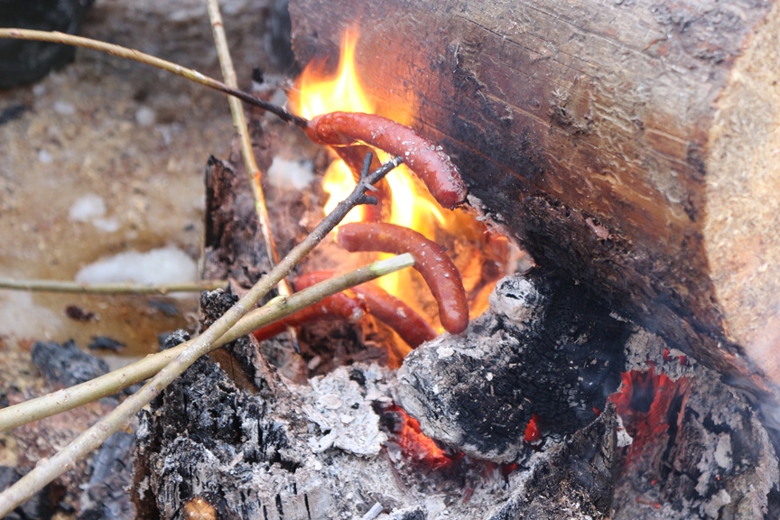 и ни как без приготовлении охотничьих колбасок и печени щуки на открытом огне