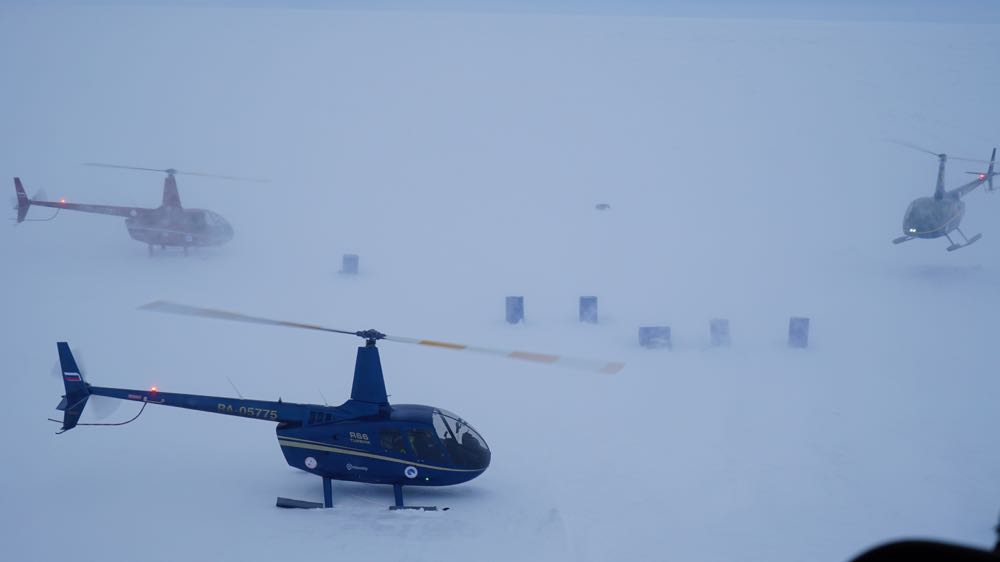 Льдина слегка уменьшилась в размерах, но места для посадки было более чем достаточно! Вертолетчики АрктикУгля сработали на "отлично"! Мы раскатили бочки к вертолетам, достали насосы и довольно быстро (сказывался приобретенный опыт!) залили топливо по нашим бакам.