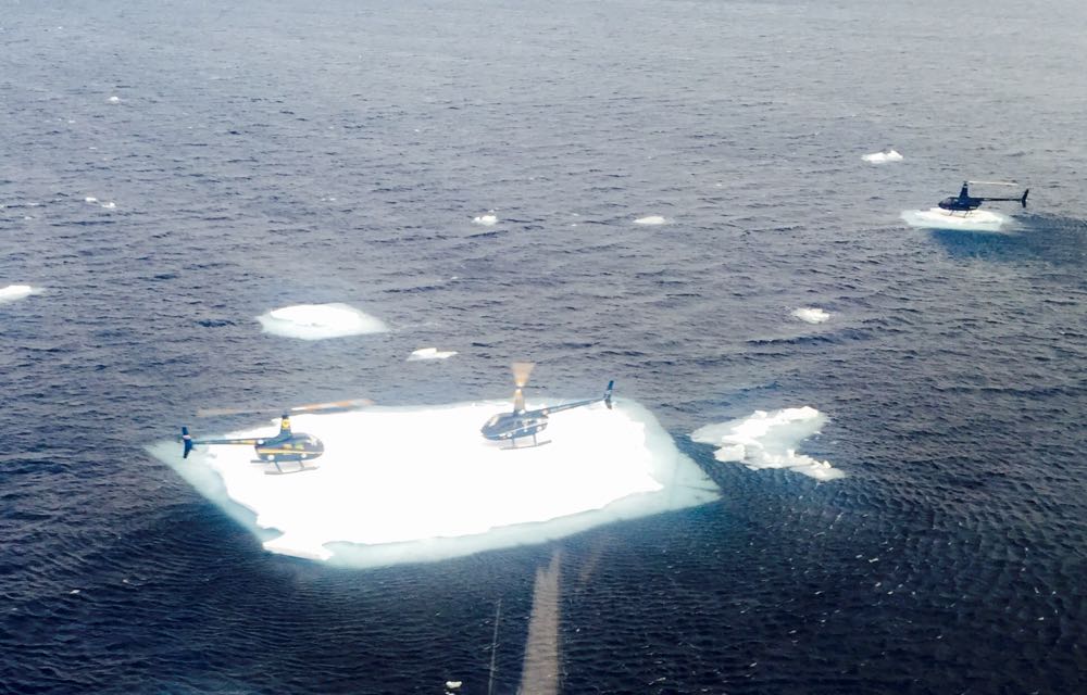 Льдина слегка уменьшилась в размерах, но места для посадки было более чем достаточно! Вертолетчики АрктикУгля сработали на "отлично"! Мы раскатили бочки к вертолетам, достали насосы и довольно быстро (сказывался приобретенный опыт!) залили топливо по нашим бакам.