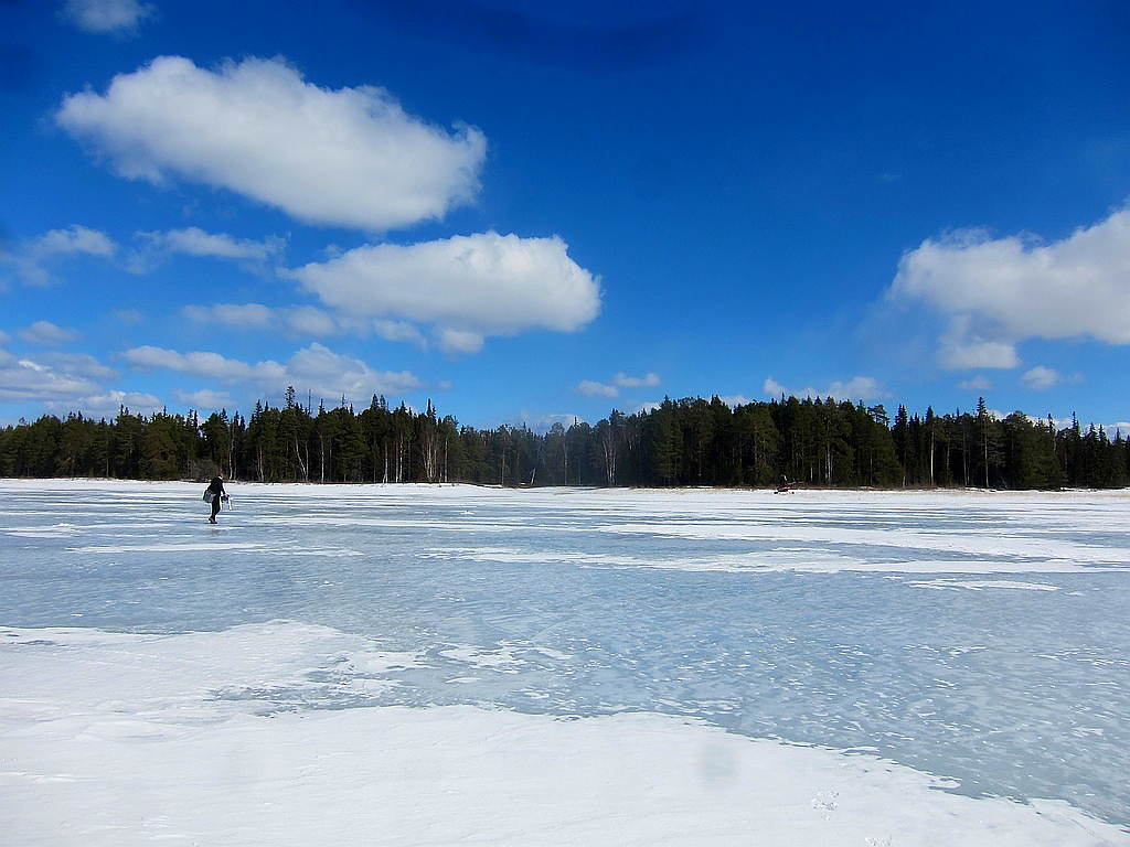 Тогда в Вожгоре, мужики на мой вопрос про возможное наличие рыбы, рассказывали, что когда в округе в деревнях жило много людей, рыбаки ловили постоянно и бурили лед по весне и рыба ловилась хорошо. А после уже бурить стало некому и лед стоял монолитом и после вскрытия озера ото льда, рыбаки начали находить массу задохнувшейся без кислорода рыбы. Уж не знаю, правда это или нет, но я поведал, эту историю Алексею.