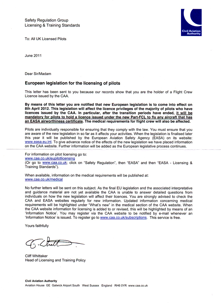 Многие из вас получили письмо от САА, информирующее вас о изменениях в лицензировании, которые должны вступить в силу с 8-го апреля 2012, когда EASA (Европейское агентство авиационной безопасности) реализует новое европейское законодательство. Мы попытались обобщить основные моменты для вас. Во-первых, несмотря на плохую организация этой реформы (или, может быть, из-за этого!), нам кажется, что есть мало причин для беспокойства и, надеюсь, это будут только "бумажные упражнения" для переоформления британской национальной или JAR-лицензии (и, конечно, раз CAA участвует, без сомнения, вам придется потратить некоторое количество денег!). Любой держатель JAR (PPL, CPL и т.д.) лицензии, выданной до 8-го апреля 2012, автоматически получат лицензии EASA, которые должны быть физически заменены до 8-го апреля 2017. Национальные британские (не JAR) лицензии должны быть заменены на лицензии EASA до 8-го апреля 2014 (или 2015 для некоммерческих целей). NPPL станет LAPL (лицензию пилота воздушного судна для светлого времени суток), которые будут действительны для полетов по всей Европе и будет содержать рейтинги, т.е. SSEA, как и раньше. Но будет новый LAPL Medical - опять же детали еще предстоит доработать. Переходный период, как ожидается, до 8 -го апреля 2015. JAR-FCL 3 Medical останутся в силе и будут заменены на медицинские сертификаты EASA при последующем возобновлении или медкомиссии. Рейтинг IMC, в то же время перестанет существовать в его нынешнем виде, и будет выглядеть, как просто вписывамый в предлагаемый упрощенный европейский рейтинг IR для частных пилотов - будет действителен во всей Европе. Если привилегии окажутся более строгими, чем старый рейтинг IMC, то было указано, что будет возможность для существующих держателей рейтинга сохранить свои привилегии в границах воздушное пространство Великобритании.
