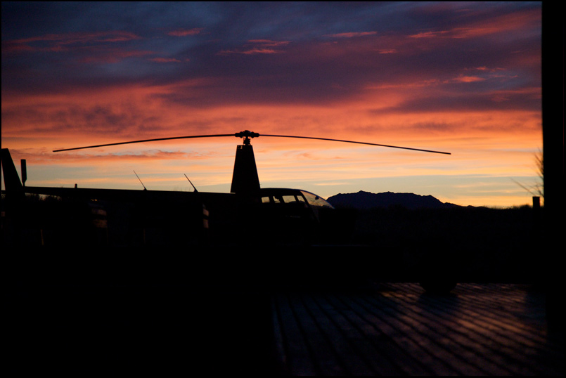 Через 10 минут после взлета загорается лампочка «Fuel Filter». Ощущения мои понятны.. Высота около 6000 футов, плюс 36, горы, пустыня. Встречный ветер притормаживает вертолет до 130 километров в час. От гор еще и турбулентность, чтоб их... Плюхаюсь на какой-то куст. Воды нет, бензина впритык. Смеркается. Вечер обещает быть томным. Рассуждения в стиле того, что «.. ну лампочка, она же ведь желтая, значит - не страшно.. да и в РЛЭ написано - «приземлиться, как только сможете».. а я ведь пока не могу? Нет, не могу.. Летим дальше».