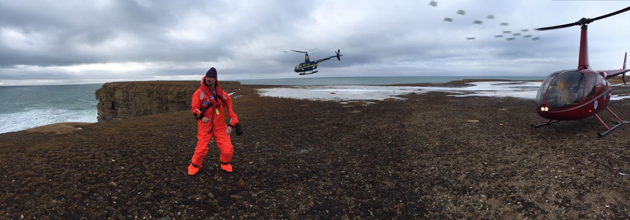 Утром 14 апреля мы были готовы к вылету. Английский борт с Борисом и Кью собирался вставать на свой маршрут из Хаммерфеста, а мы - на свой, но из Лонгийера все пять машин должны были уходить группой, это было непременным условием авиационных властей. Вертолеты накануне были заправлены, мы вышли из номеров в спасательных костюмах (окружающие посматривали на нас с некоторым удивлением) и на двух таксомоторах приехали в аэропорт. Взлетели группой, как вдруг Кью еще до первого разворота доложил о посадке по технической причине. Мы встали в круг в ожидании - что там у них случилось? Через пару минут Кью доложил взлет и по радио сказал нам, что у них болтался и стучал по фюзеляжу ремень безопасности с заднего сиденья