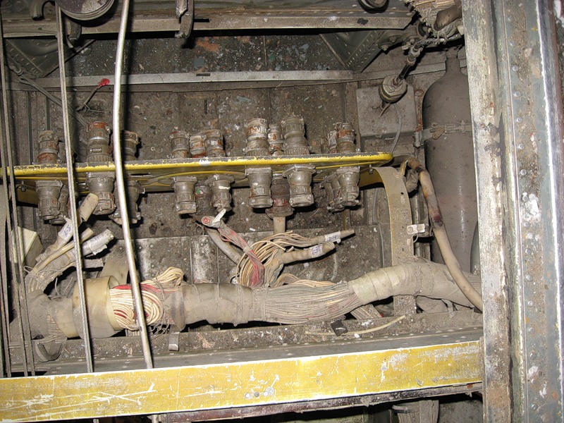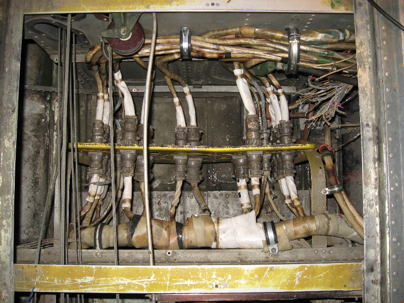 Центральная коммутационная панель. Сюда сходятся провода управления и индикации всех систем самолета: моторы, генераторы, запуск, топливная, масляная, противопожарная системы, освещение и сигнализация и многое другое... Такой мы увидели ее зимой. Напоминает ампутированный спинной мозг: За прошедшее время нашли и "пришили" почти все "нервные окончания". Освоили оригинальные технологии тех лет - жгутовку кембриком и бандажи из ниток