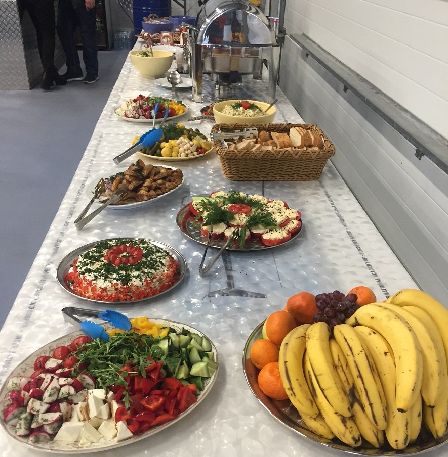 Вы заходите в ангар – там же доска с информацией о заданиях, судьи, весь народ... И утыкаетесь мордой в красавиц с ножами в руках! Под ножами тают пучки зелени… и вот уже вас лишает воли аромат плова и других яств, которые уже готовы, но накрываются пленочкой до подачи на обед… Вот как раз во время грозы, под грохот льющейся с неба воды все с удовольствием и подзаправились.