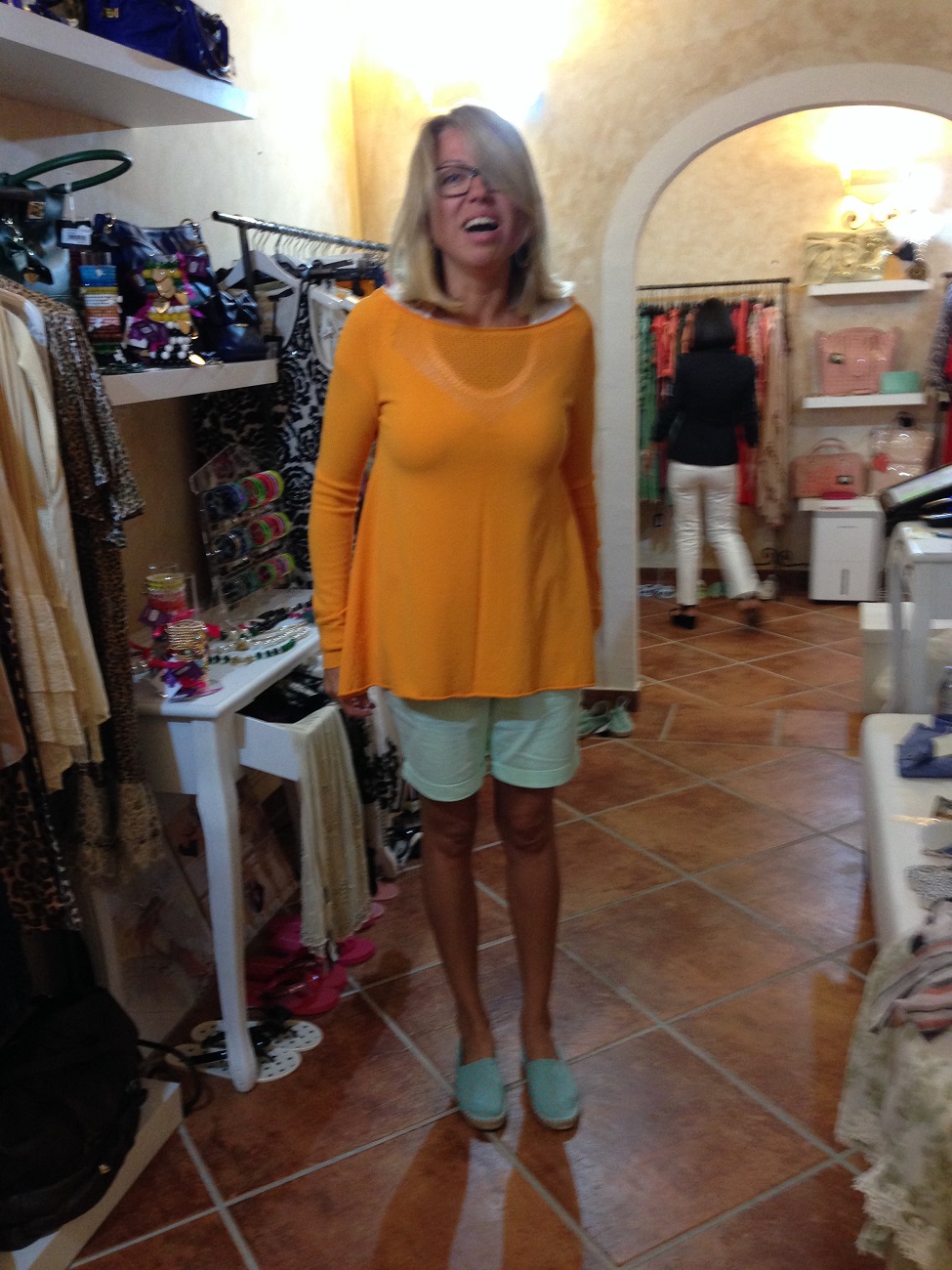 С этой целью мы с Таней отправились в пляжный магазин, где оказались перед непростым выбором: теплый толстый свитер, щедро украшенный стразами, блестками и перьями, плюс кожаные кроссовки с золотыми шипами по всей поверхности, или же тоненькая оранжевая кофточка плюс эспадрильи (тряпочные тапки).