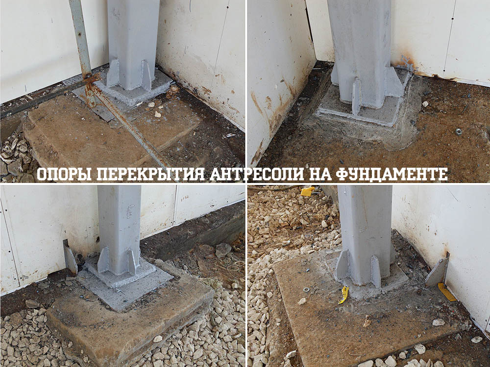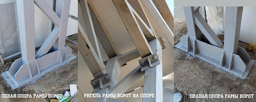 Как я писал выше, конструкция силовой рамы ворот никак не должна касаться собственно ангара и при этом должна держать вес не менее двух тонн (две секции роллетных ворот). Установлена она на собственном заглублённом фундаменте. Ровно так же, как и опоры антресольного этажа. На фото эти узлы показаны крупным планом. Центральный стыковочный узел перекрытий и рамы по моей просьбе был значительно усилен, сверх того, как это предусматривалось проектом. Кроме того, сделали центральную опору перекрытия антресоли там, где она не мешает. По проекту она не предусматривалась, но береженого бог бережет... Я всегда подхожу к таким вещам с принципом "надежность дороже денег".