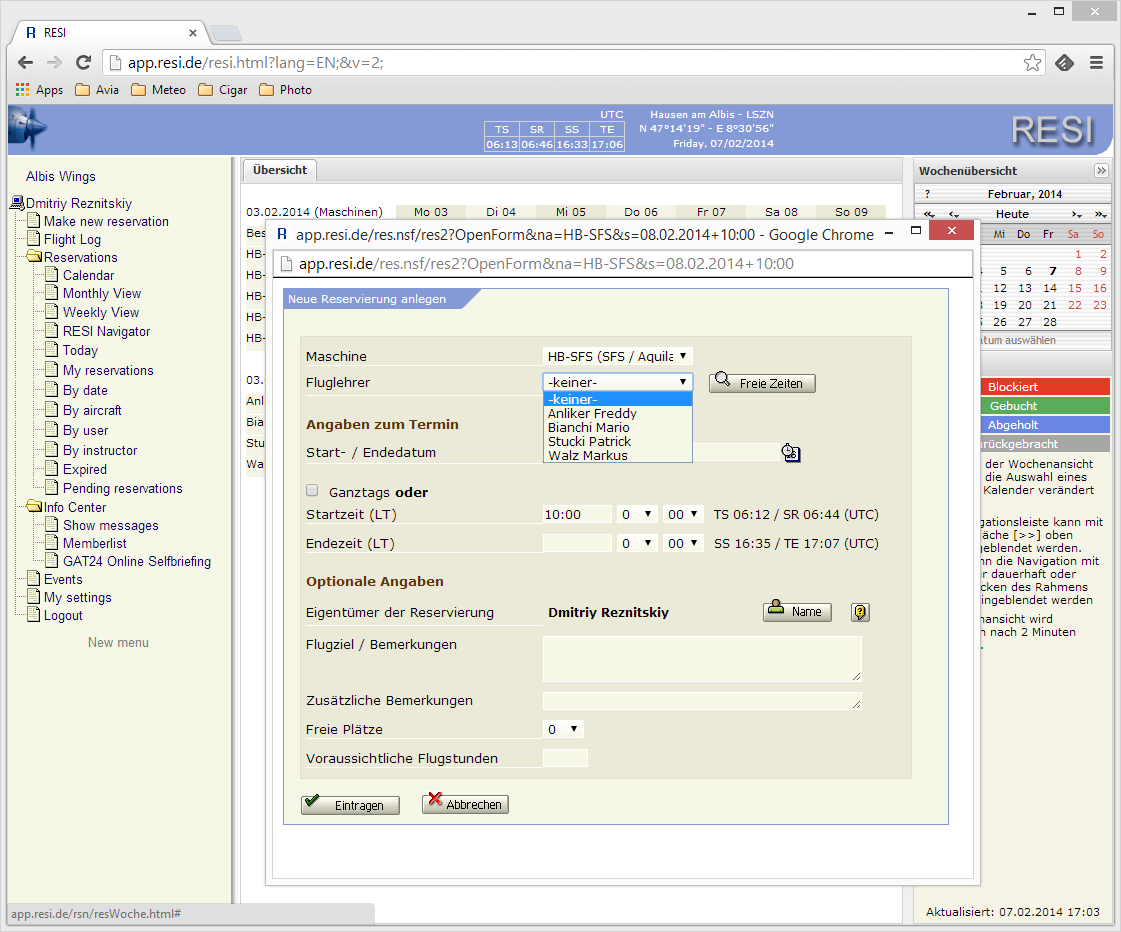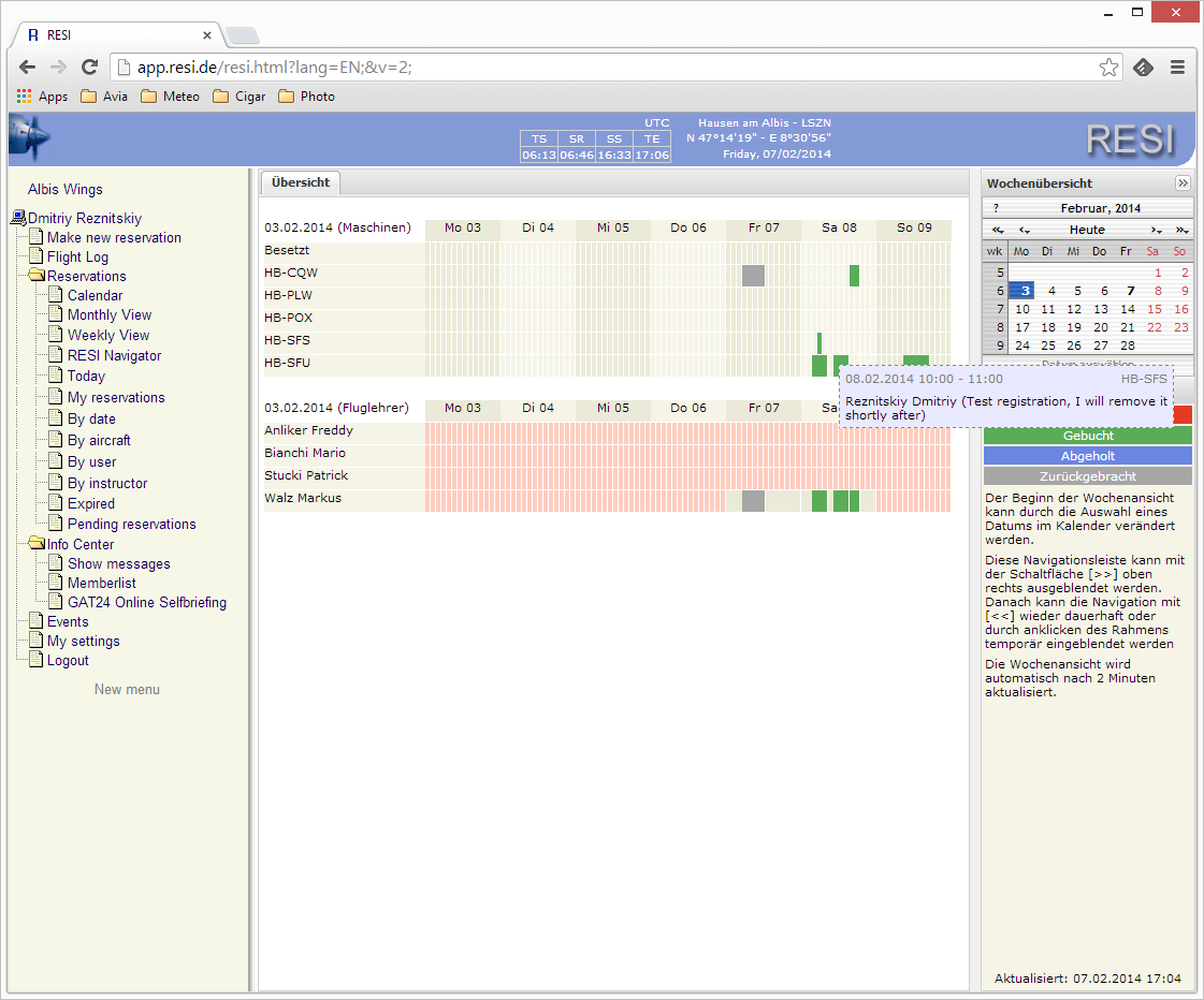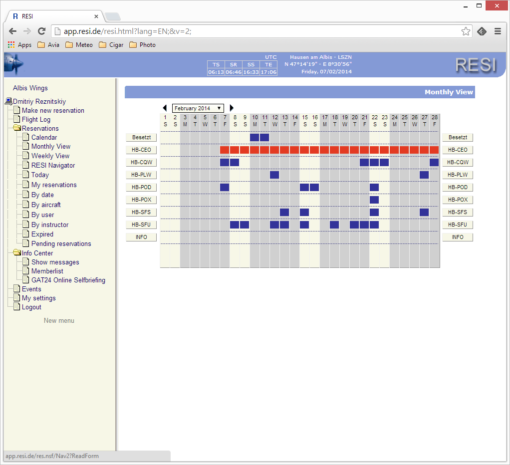 Вход в систему, ничего особенного. При заходе с айфона, сначала что-то говорит "про мобайл", но потом переходит на обычный сайт. Неудобно. Слева -- список доступных действий "видов", справа -- сразу список доступных самолётов. Месячный вид. Толком пользоваться только для долговременных бронирований, имхо. Самое интересное -- недельный вид. Сверху -- самолёты, снизу -- инструктора. Цветом кодируется "занято", "самолёт в брони", "самолёт отлетал", т.п. Дни "разбиты" по часам, но во во время бронирования можно вбить любые часы-минуты. Бронирование самолёт (и инструктора). Система сразу отслеживаетс занятось. Если самолёт и/или инструктор занят, система поставит в очередь (смс, емыл -- сразу сообщит). Можно бронировать на несколько дней, т.п. Сразу же можно указывать "сколько свободных мест доступно в самолёте". Вкратце для других это выглядит так. Опять же слева, в members list можно найти забронировавшего самолёт и позвонить или отправить ему емыл. Пару раз мне это было нужно (ломался самолёт, человек до меня что-то забывал, т.п.) Просмотр/удаление/... В системе предусмотрены роди администраторов, которые могут редактировать/удалять чужие брони. Когда я прихожу летать, мне надо "взять" самолёт. Ничто не мешает мне его сразу и "вернуть" (погода исортилась, понос пробил -- что угодно). Вцелом, это значит, что "я собрался летать, выкатываю самолёт из ангара, заправляю, т.д." По прилёту я должен самолёт "вернуть" (этот шаг я не показал, но это просто ещё одна кнопка). После этого я должен ввести запись(и) в логбук. Тут всё просто. Блоктайм (в нашем клубе) никого толком не волнует, мы считаем только время в воздухе. В этой форме есть три места, которые должны совпасть, и это как бы проверка, что человек всё ввёл правильно (да, были случаи, когда человек вводил неправильно и или я звонил ему с просьбой исправить, или инструктор (он же администратор) правил чужую запись). Значения для counter end берутся от соотв. прибора в самолёте После полётов, раз в месяц я получаю по почте счёт. "Счёт считается" по следующим полям: