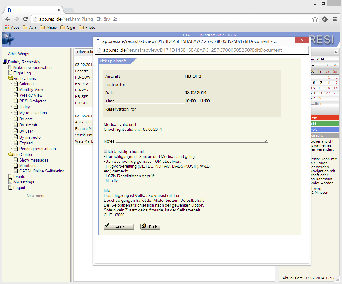 Тут образовался владелец самолёта, который "своим, проверенным знакомым" готов сдавать в аренду этот самый самолёт. Бронирование организовал через эту же RESI. Стоимость услуг самой системы мне (и ещё нескольким) обходится в 20фр/год с носа. Сколько стоит "организация миниклуба" -- не узнавал.
