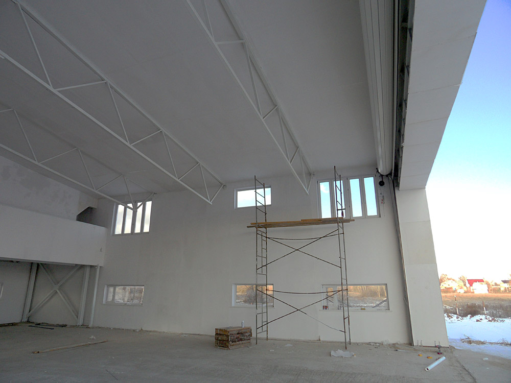После установки ворот, наконец начались работы по зашивке и утеплению фронтальной части ангара. Эти работы тоже еще не завершены, но к концу ноября будут полностью выполнены, что позволит полностью перекрыть периметр ангара от холода и создать внутри комфортные условия для окончания внутренних отделочных работ по ангару.