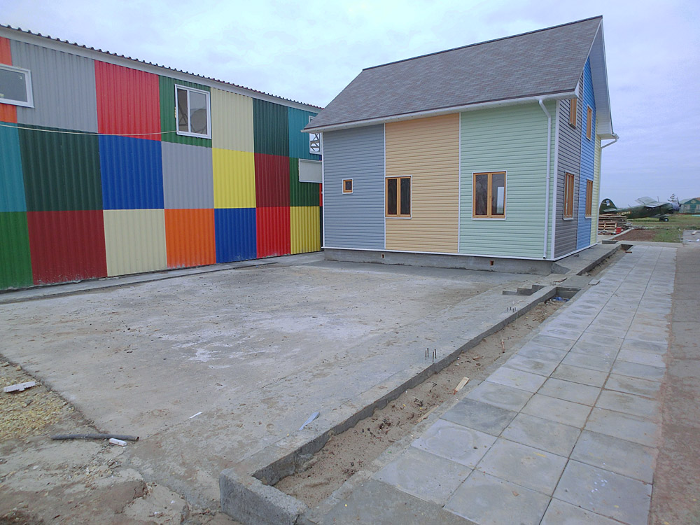 Прежде всего, учитывая глинистый характер почв и наклон территории аэродрома, нужно было принять специальные меры по отводу дождевых и талых вод от перрона, дома и ангара. Для этого было сделано много всего... Вокруг ангара сделана широкая ж/б отмостка с "плинтусом", чтобы запечатать возможные щели и протекания по фундаменту ангара. Забетонированы участки вокруг домика и под переходом в ангар. Устроена бетонная стена по длинной стороне, по границе с соседним участком. При этом выполнены наклоны и стоки так, чтобы вода отводилась от участка. Совместно с соседом, пограничный участок с соседним ангаром забетонирован, выложен плиткой - так же с наклоном, с учетом стока воды. Чтобы облегчить пути движения людей, устроены две лестницы, для прохода между участками. Убогая деревянная лестница в дом заменена на широкую, бетонную.
