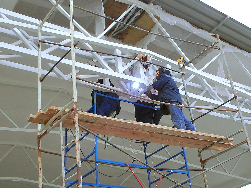 Силовая ферма, спроектированная первоначально, потребовала дополнительного усиления - как в горизонтальной части, так и в опорах. Потребовалось это из-за того, что роллеты ворот установлены консольно, с вылетом за обвод рамы, что приводит к появлению скручивающих моментов на ферме. Поэтому раму пришлось обратно демонтировать, доваривать и снова устанавливать.