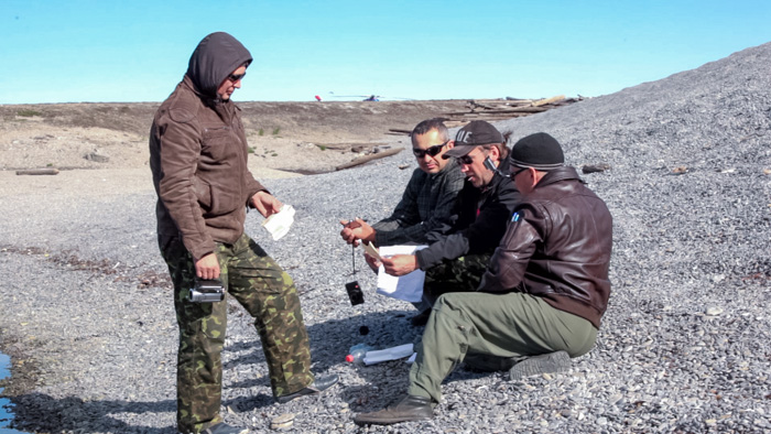 Идя по берегу к вертолету нас провожала стайка более молодых особей,любопытничая нет ли у нас сувениров или хотя-бы карандашей "100 лет Полярной Авиации"