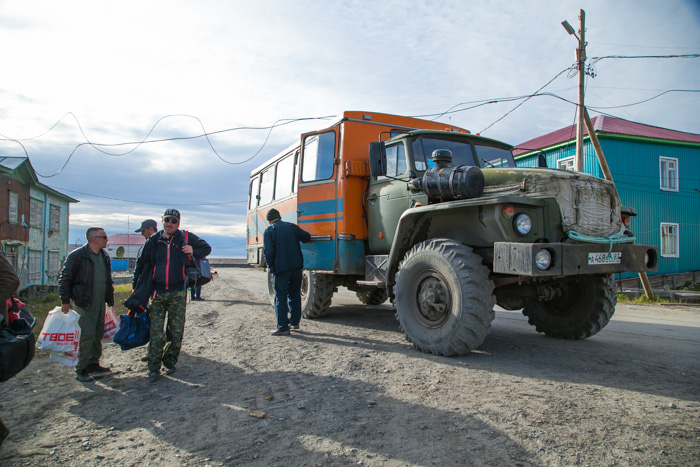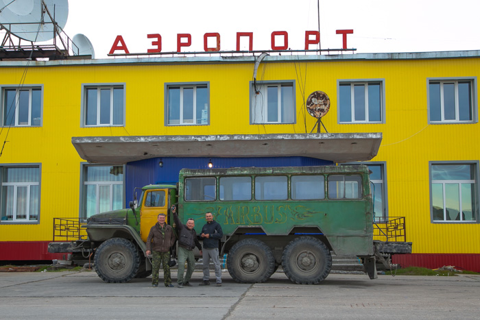 Директор магазина Алексей пообещал нас отвезти в аэропорт после обслуживания владельца оленей, но некоторые, самые нетерпеливые, уже отправились туда пешком. Тут подъехали пограничники и тоже предложили свою помощь - все-таки, за минувшую ночь мы местному населению стали симпатичны. Мы поехали с Алексеем, а погранцов попросили по пути подобрать наших пешеходов.