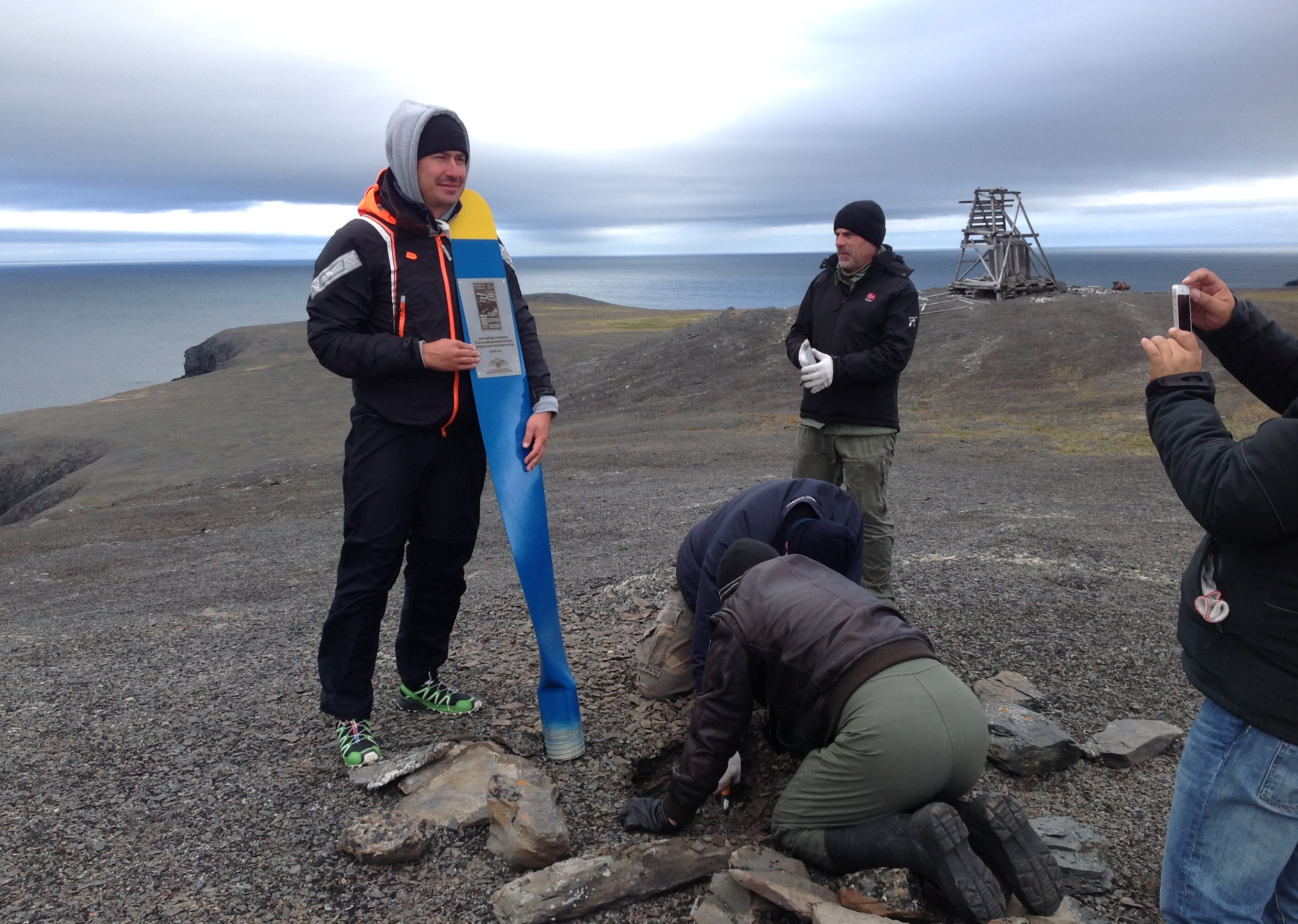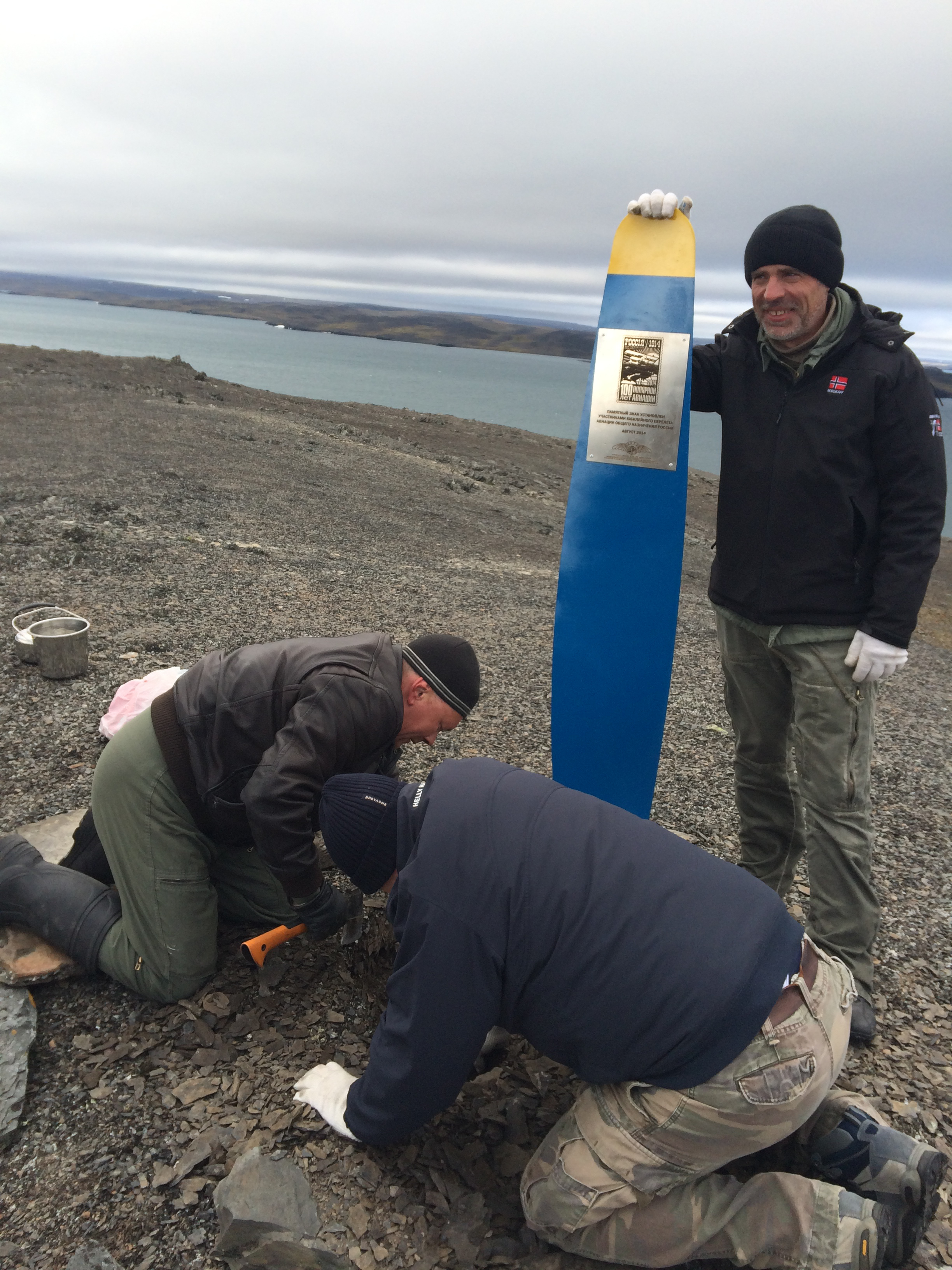 ... к моменту когда достаточной глубины "ямка" была вырублена - были созваны все участники экспедиции для торжественной установки памятной лопасти и заливки основания заблаговременно приготовленнным цементом ... для большей устойчивости мы обложили знак камнями ...