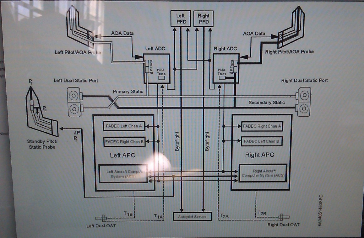 Система управления Эклипса включает в себя два отдельных компьютера, каждый из которых получает информацию от своего блока сенсоров, каждый из которых, в свою очередь, содержит, в том числе, по три вычислителя воздушных параметров полёта, каждый из которых подключён к "своему" ПВД (всего их три). Таким образом, каждый из компьютеров независимо от другого вычисляет высоту и скорости (а также положение и другие данные) и отображает на "своём" дисплее. На центральном дисплее, в верхней его части, отображается ещё один набор данных, дублирующий согласно требований FAR. Данные вычисляются, вероятно, на основании данных обоих компьютеров - нечто вроде усреднения, пока оба компьютера продолжают давать достоверную информацию.