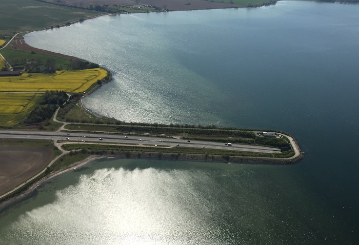 В одном месте вместо моста (звучит-то как…) через пролив сделали туннель. Но не как нормальные люди делают (с суши на сушу), а с заходом на воду. И выглядит так, будто машинки ныряют под воду…