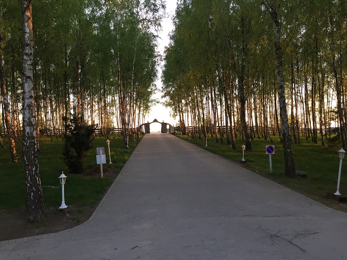 Наконец, приехал заправщик, залил борта бензинчиком под завязочку. Мы, цокая зубами, забились в такси (в раздолбанный микроавтобус! – да, это вам не Германия…) и начался получасовой ужас. Водитель гнал по узкой неровной дороге, будто за ним гналась рота пьяных красноармейцев с шашками наголо. С амортизаторами у микроавтобуса было совсем плохо, и мы попами чувствовали каждых ухаб. При этом мы успевали поглядывать по сторонам – поля, поля… Ух ты, какая красивая березовая роща! Опа, такси притормаживает перед кружевными коваными воротами. И мы едем в березовом коридоре. И перед нами – белоснежная усадьба. Вот это отель! Вот это красота! Ах, как оформлена территория!