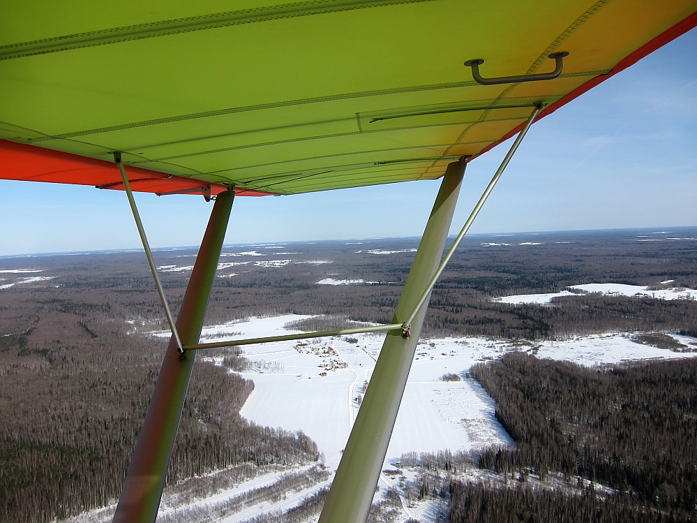 Но вот я занимаю место в Скай Рейнджере. Слушаю короткую вводную и мы начинаем разбег, километров с шестидесяти, энергичный подъем передней лыжи, потом отрыв, перевод в горизонт, разгон и набор высоты. В наборе Андрей держит 100 км/ч, самолет с внушительной вертикальной скоростью мчится вверх.