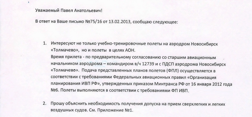 Год назад, 4 июля 2012 года отправил первое письмо в Новосибирский аэропорт "Толмачево", в котором озвучил свое желание прилететь к ним с посадкой.
