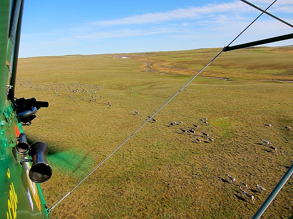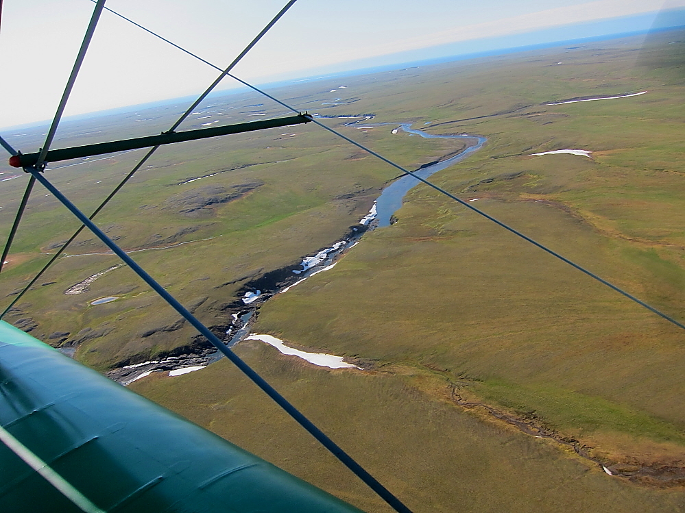 Ну а в нашем перелете появился снег на северных склонах и с каждой минутой полета его становится все больше Мы выходим в район длинной и извилистой реки Ефремова. Река хорошо знакома жителям Диксона, она относительно близко расположена к поселку и славится неплохими уловами хариуса Насчет посмотреть рыб в полете не знаю, а вот увидеть стада оленей нам удалось. Сначала мы увидели их сверху с высоты ...И после пошли на снижение. Когда скорости сравнялись, По-2 и олени составляли одно целое Наверно можно было еще снизится и посадить какого нибудь бесстрашного олененка в кабину