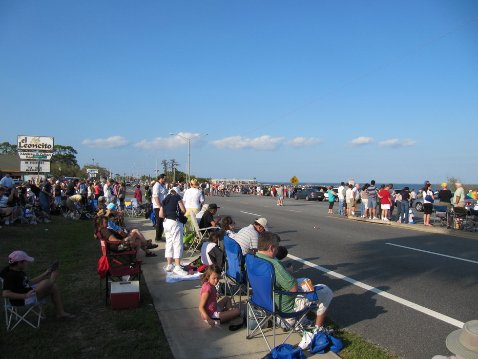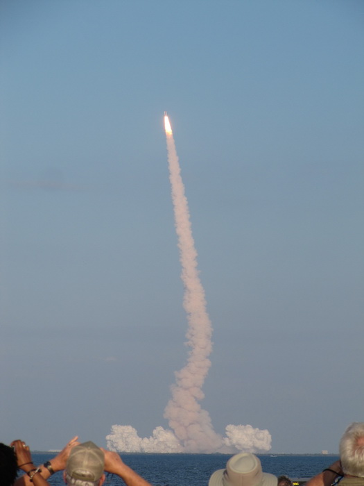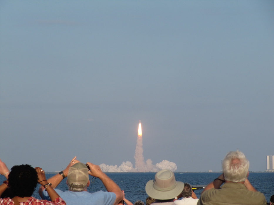 Судя по всему мероприятие решено было не откладывать. Кругом слышно было радио, с торжественными речами, народ поглащал кока-колу и пиво, пережевывал тысячи мак булок. Со стороны все это выглядело большим слетом саранчи , которая заполнила все побережье, дороги, дома , крыши… Все ждали зрелища. На другом берегу стояла огромная петарда, запуска которой так ждала местная саранча. И вот , в вдруг, в какой-то момент чавканье и отрыгивание приостановилось и воздухе возникло колебание иного характера. На зависть китайцам, которые впереди планеты всей по петардам, американцы переплюнули их на этом поприще и пульнули в небо огромным куском железа , сверкающем и оглушительным… Мак булки были заменены на фотоаппараты… Даже с такого расстояния , в иллюминаторах шатла были видны ох....ие рожи астронавтов. Еще через минуту, шоу закончилось, саранча зашевелилась и засобиралась домой. Учитывая полученный опыт, мы не стали стоять в общей дорожной пробке, а воспользовались огромным количеством параллельных и перпендикулярных дорог и через полтора часа были дома.