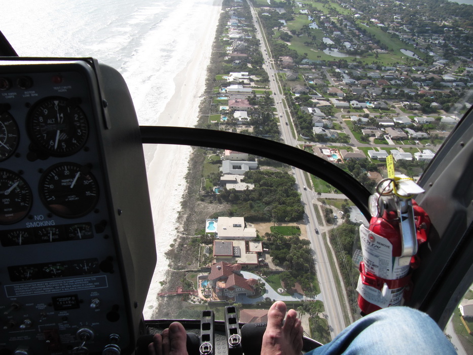 Если бы еще знать как! Я урадкой покрутил ручку газа, отметив в какую сторону изменяются обороты и попробовал запомнить поряк движений ручкой и рукояткой. Я летел уже минут пять, мне это казалось вечностью, я не понимал почему мы не двигаемся вперед?? Я скользнул взглядом по приборам и совершенно случайно остановился на указателе скорости , и тогда меня осенило! Указатель скорости болтался в районе отметки 60 узлов! Так вот оно в чем дело! На самом деле мы летели вперед! Но это было настолько медленно и непривычно для глаз, что создавалась иллюзия висения на месте! Я перевел взгляд на землю под вертолетом и о чудо, она действительно медленно ползла на нас. Я приободрился, Джереми начал меня гонять по высотам: набери 700, теперь 500! обороты, теперь курс 90, высота 800. Я пыхтел. Долетев до побережья, я передал управление инструктору и начал просто наслаждаться пейзажами и фотографировать. Потом мы мы развернулись и пошли обратно. Мне предстояло самое страшное- висение. Когда подошли к аэродрому Джереми, предложил показать процедуру круга и посадки а потом дать попробовать мне. Он сделал круг, посадил вертолет и предложил мне повторить. Я с настороженность. потянул шаг и вертолет отлип от земли, завис метрах в двух от нее и … я висел! Вертолет слегка покачивался и слегка ползал . Оказалось все не так сложно. После этого мы сделали пару заходов и время закончилось. Я был в восторге от того что у меня получилось висение. Мне захотелось еше! Предупредив что надо полетать еще, я набрал Диму и предложил приехать и по присутствовать. Дима был через пол часа, сфотографировал сначала свинью в офисе, потом принялся фотографировать меня.