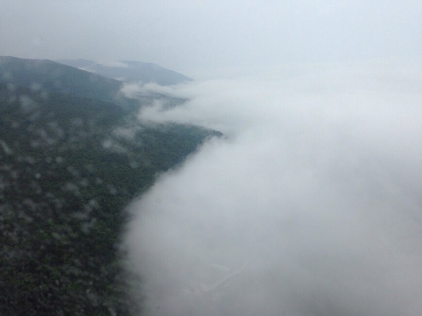 Действительно, с утра не пробиться было на север. Слоистые облака лежали на кронах деревьев уже в нескольких сотнях метрах от береговой линии. Шла морось. Дальше рельеф только поднимался. И я продолжил вчерашнюю тактику - идти вдоль берега, где хоть что-то видно, и точно нет проводов. Кстати, ЛЭП здесь навалом. Куда они только ведут? Почти никто не живет.