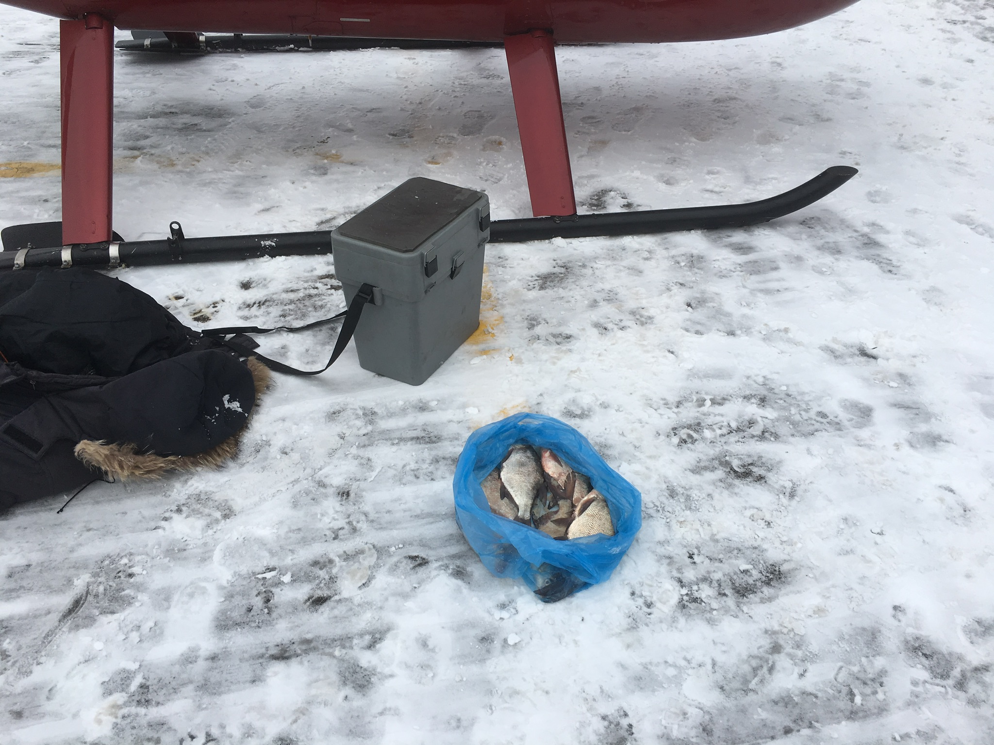 Лед уже нормальный. Но пока оставлял вертолёт на острове. В следующий раз буду на лёд садиться. Три дня будут стоять морозы. Так что лёд наростёт до 35-40 сантиметров. Главный плказатель толщины льда, это машины рыболовов на льду. :D А крайнне фото улова с вертолётом, сделано уже на площадке базирования.