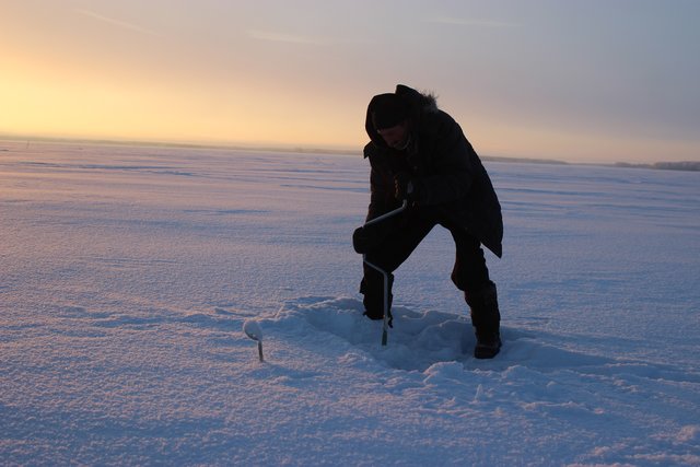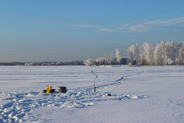Погода по всему маршруту была хорошей. Но сам остров Могильный был уютно укутан приземным туманом. Пришлось немного вернутся и нырнуть под это туманное одеяло и уже под ним, на высоте 10-15 метров подползти к острову. Посадка на остров Пока выгружались дымку сдуло и появилось голубейшее небо! Я побоялся садиться на лёд. А зря! Лёд уже достаточно прочный. Пройдёмся немного по морозцу. Ушли не очень далеко Сначала забуриваемся Потом готовим бутер капризной подмосковной рыбе. Фик знает, что она сегодня хочет. Ни и немного зимней красоты и лосей