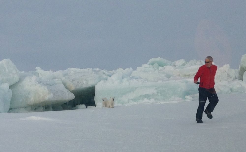 По пути на Средний мы с Димой впервые в жизни увидели во льдах белую медведицу с двумя медвежатами и сделали несколько снимков. Летевшие в Ми-8 другие участники экспедиции потом страшно нам завидовали. Оказалось, медведи боятся вертолета. Медведица бросила на хрен медвежат и стала убегать. Мы подсели к медвежатам, и Дима вылез со своим айфоном их снимать. При этом мы точно не знали, как далеко находится медведица (обзор закрывали торосы выше человеческого роста), но я был готов взлететь и отгонять ее вертолетом.