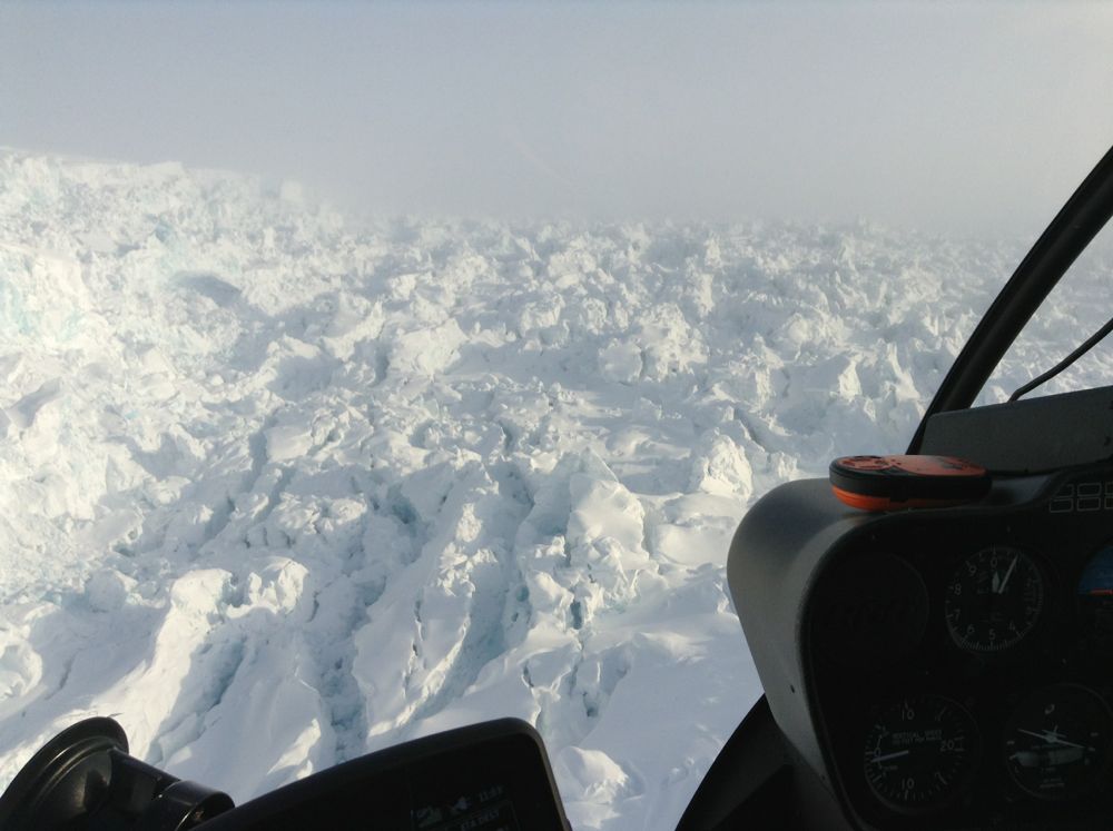 Утром 7 апреля мы вчетвером взлетели с аэродрома. Прикованные «решением командования» к Земле, военные летчики печально провожали нас, не вставая с кроватей (мы с Димой ночевали в одном кубрике с комэска и штурманом эскадрильи). Кроме четырех человек и запаса топлива на 6.5 часов на борту находились наши с Димой НАЗы, некоторый инструмент и три буя килограммов по 10-15 каждый. Вертолет взлетал тяжело, несмотря на плотный морозный воздух и довольно сильный встречный ветер. Мы направились сразу в открытое море и примерно через два часа совершили первую посадку на лед.