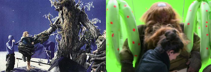 «На «Властелине Колец» много работали с традиционной техникой спецэффектов, если нужно было «оживить» многочисленных существ. Когда актеру Лоуренсу Макоаре (он же Луртц) нужно было сниматься, для начала ему нужно было просидеть 12 часов в гримерной; а для того, чтобы Мерри и Пиппин могли сидеть на ветвях у Древня, его построили в виде большой аниматронической куклы. А уже в «Хоббите» цифровыми стали не только Горлум и тролли, но и почти все остальные создания. Если раньше когти орлов для спасения Фродо и Сэма были сделаны в натуральную величину, то в 2012 году актер Стивен Хантер, играющий Бомбура, висит в объятиях больших зеленых сосисок.