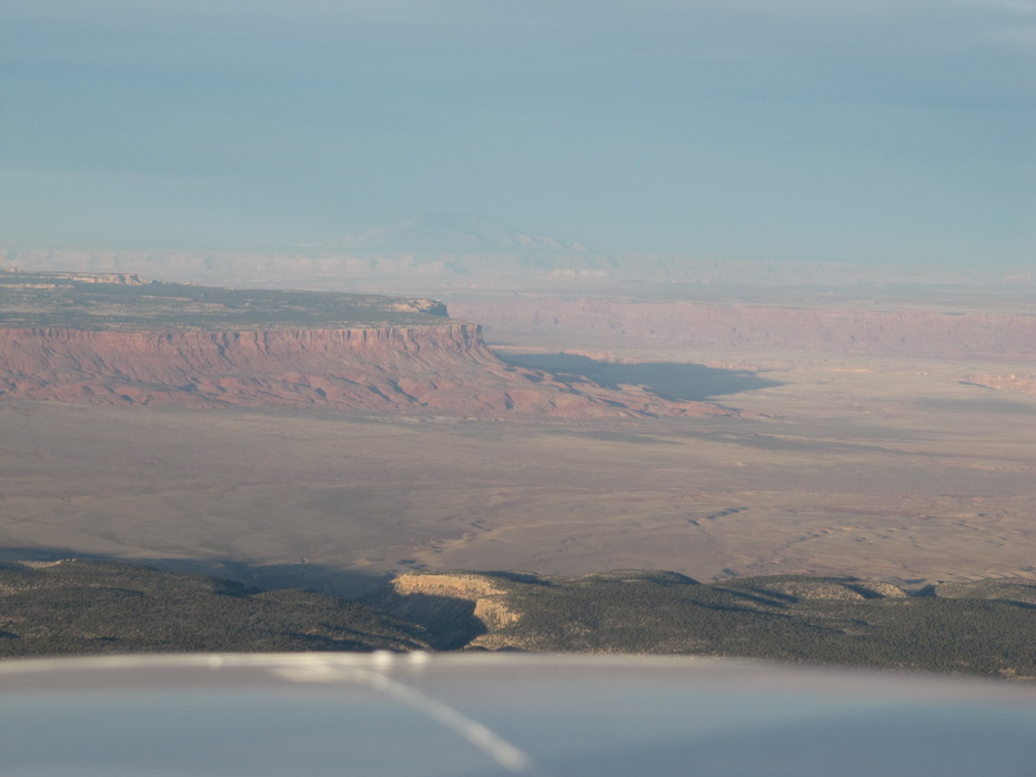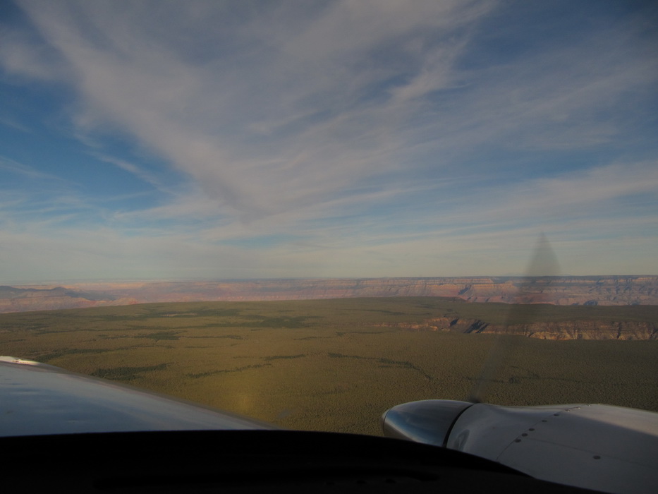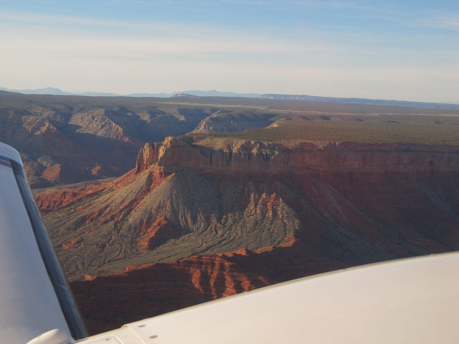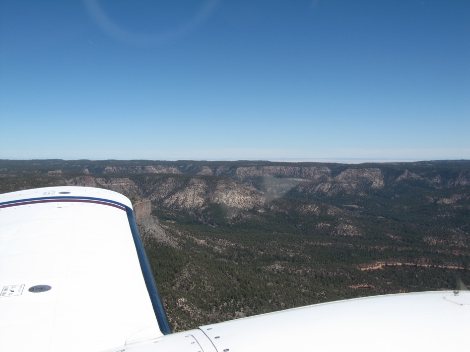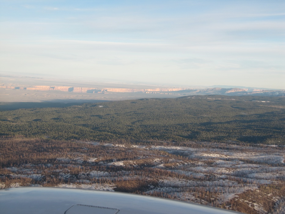 Вылетев С Гранд Каньона , мы набрали 9500 футов и перелетев на другую сторону каньена , пошли практически вдоль него. Мы летели над причудливыми разрезами и через какое-то время подошли к хребту с высотами до 9200ф, который надо было преодолеть. Набрав еще немного высоты, мы стали перелетать через хребет. Он как-то не вписывался в общую картину. Мало того, что он был покрыт снегом, он был покрыт лесом и похож скорее на подмосковье зимой, тем более что все полянки были изрисованы следами от снегоходов. От куда они только здесь взялись, в этой глуши?