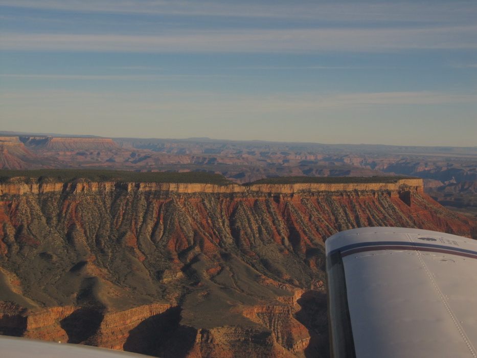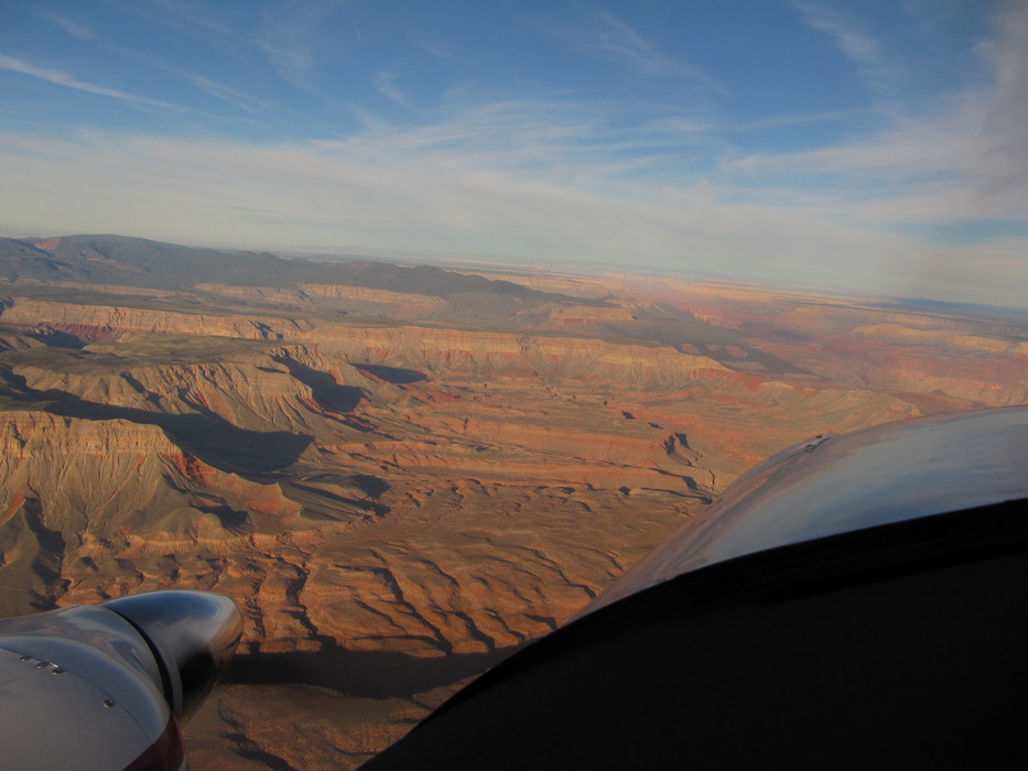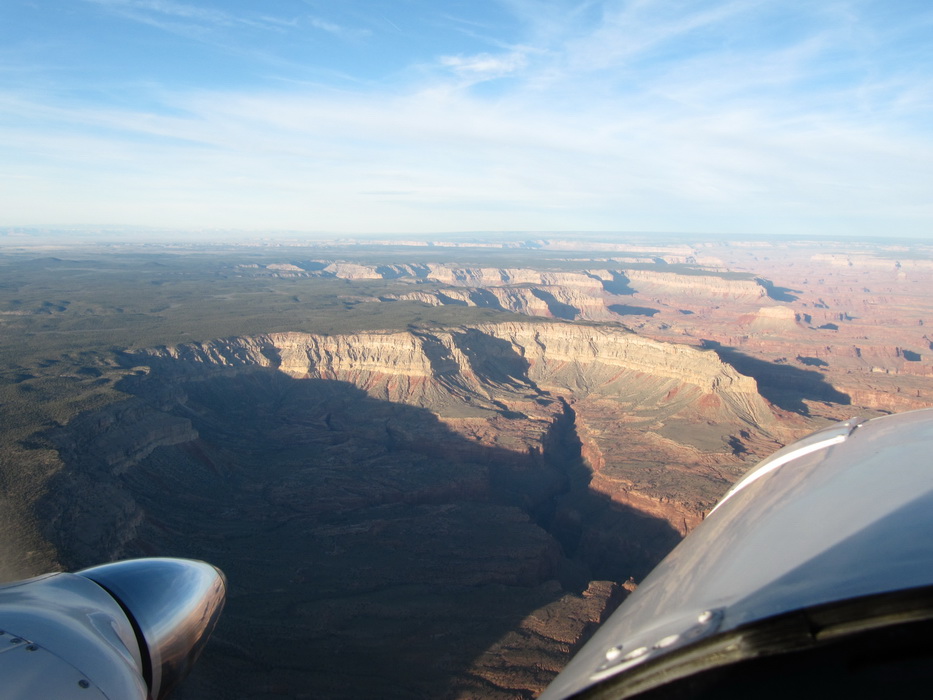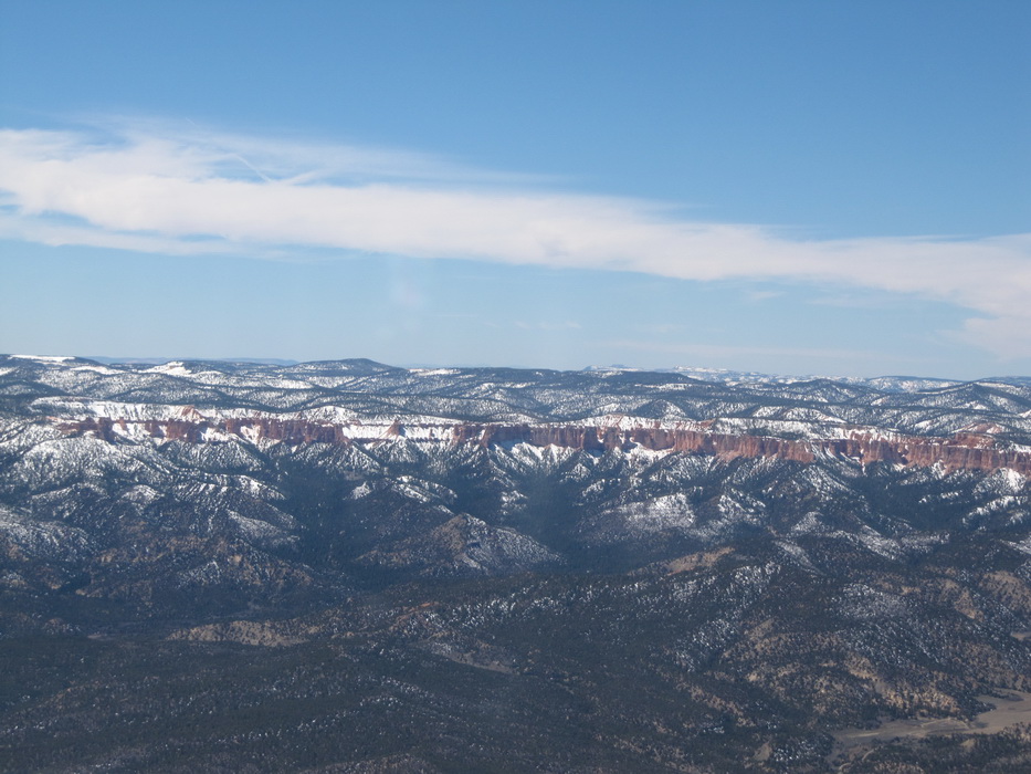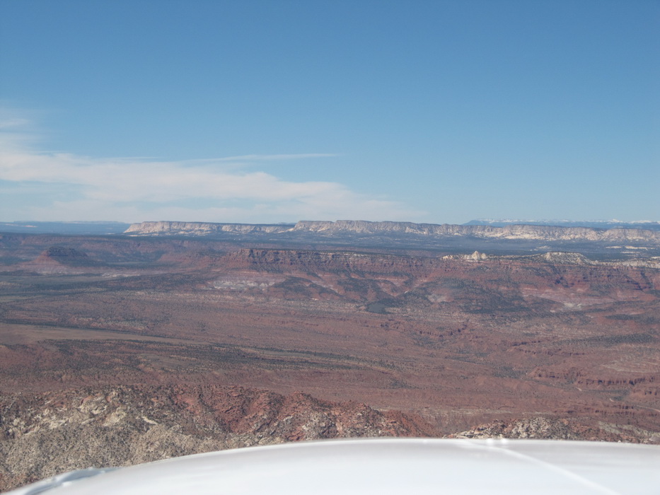 Вылетев С Гранд Каньона , мы набрали 9500 футов и перелетев на другую сторону каньена , пошли практически вдоль него. Мы летели над причудливыми разрезами и через какое-то время подошли к хребту с высотами до 9200ф, который надо было преодолеть. Набрав еще немного высоты, мы стали перелетать через хребет. Он как-то не вписывался в общую картину. Мало того, что он был покрыт снегом, он был покрыт лесом и похож скорее на подмосковье зимой, тем более что все полянки были изрисованы следами от снегоходов. От куда они только здесь взялись, в этой глуши?
