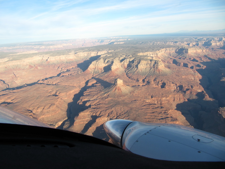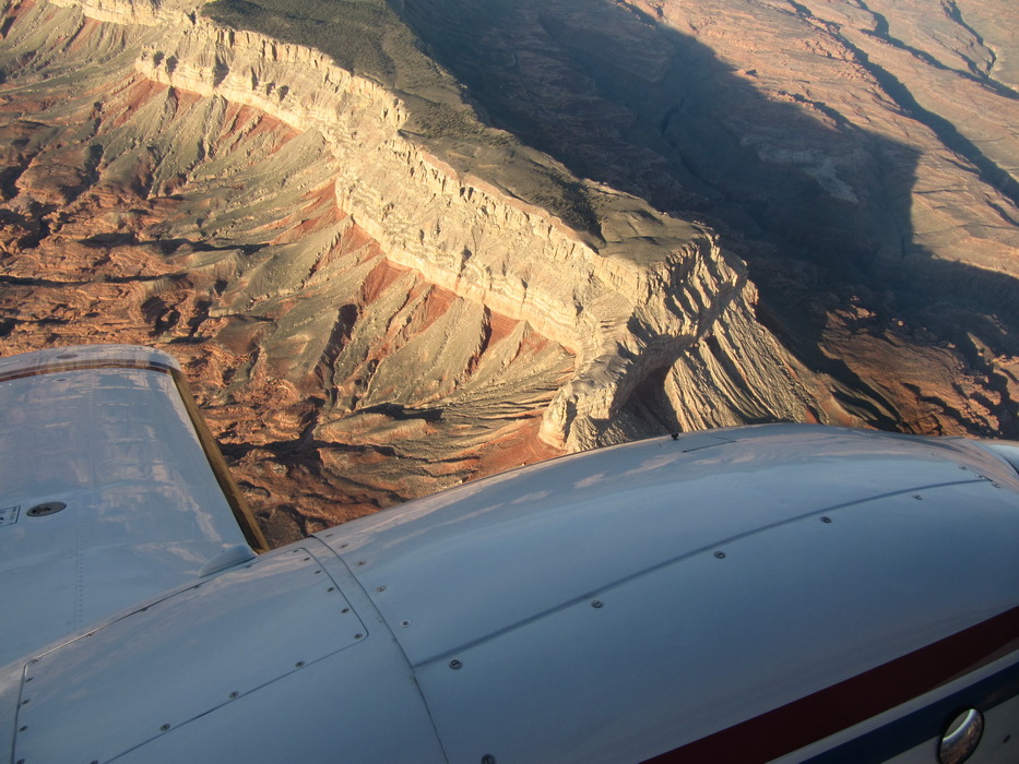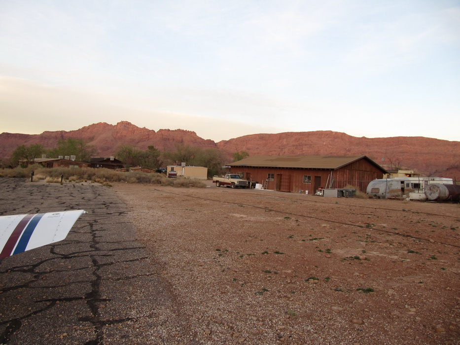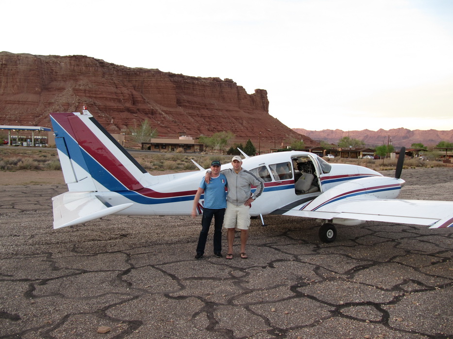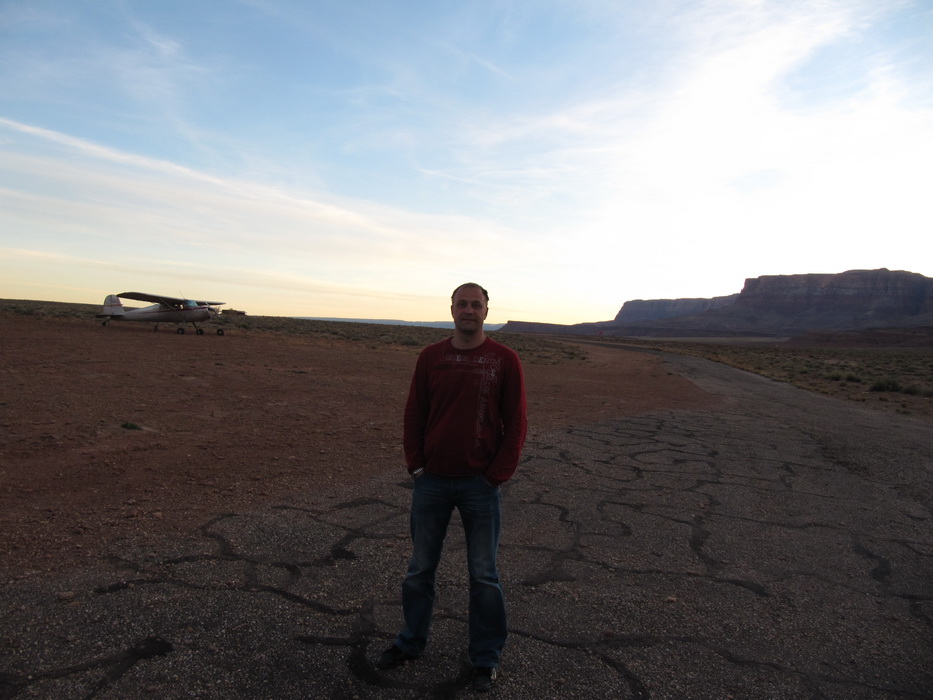 Через час полета мы подощли к Марблe Каньен. Времени оставалось мало и мы могли опять попасть во все блудные с ночной посадкой на незнакомую полосу, а после истории с невключенной полосой в Вегасе, как-то рисковать уже не хотелось. Поэтому мы оказались перед выбором: либо сразу лететь в Пэйдж, либо быстренько-быстренько…. на этом и порешили. В Марблe Каньен надо было «падать» с 10000 до 3600,причем края каньена были на 7000ф. Полоса располагалась под северной стенкой. Падаем до 7000, огибаем северную стенку каньена и ищем полосу. Идем вдоль стенки, постепенно снижаясь, докладываем подход и посадку с прямой. Полосы пока не видно. В каньене солнышка уже почти не видно и полоса плохо различима. И наконец, вот она! Из обещанной ширины в 35футов, реально покрыто асфальтом наверное, метров 7-8 не больше… Мы заходим на эту тропинку, под нами мелькает ущелье, надо же, в каньене есть еще каньен! И прямо перед полосой! Отличный вариант в случае выката! Касаемся асфальта или точнее того , что от него осталось,- разбитый асфальт шириной 7 метров в перемежку с красным щебнем! Долго катимся, стараясь держаться по средине асфальтовой полосы, но кажется, что ее ширины не хватает и винты поднимают мелкий щебень, который бьет по корпусу и стабилизатору… В конце-концов мы до руливаем до стоянки, которым является маленький пятачек, в конце кривой полосы. С трудом примостив самолет, быстро выпрыгиваем из него, и тут случается чудо, самолет покатился! Я в это время сижу за штурвалом и ничего не понимаю! Тяну на себя стояночный тормоз, никакого эффекта, жму что есть силы на тормоза, самолет еще прокатывается метров пять и останавливается. Мы в недоумении… и только отойдя от самолета, понимаем, что пятачек стоянки расположен под таким уклоном, что никакой ручник не удержит. Сидя в самолете мы этого не заметили.