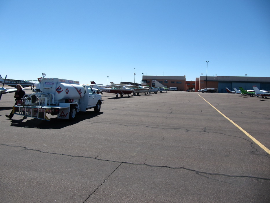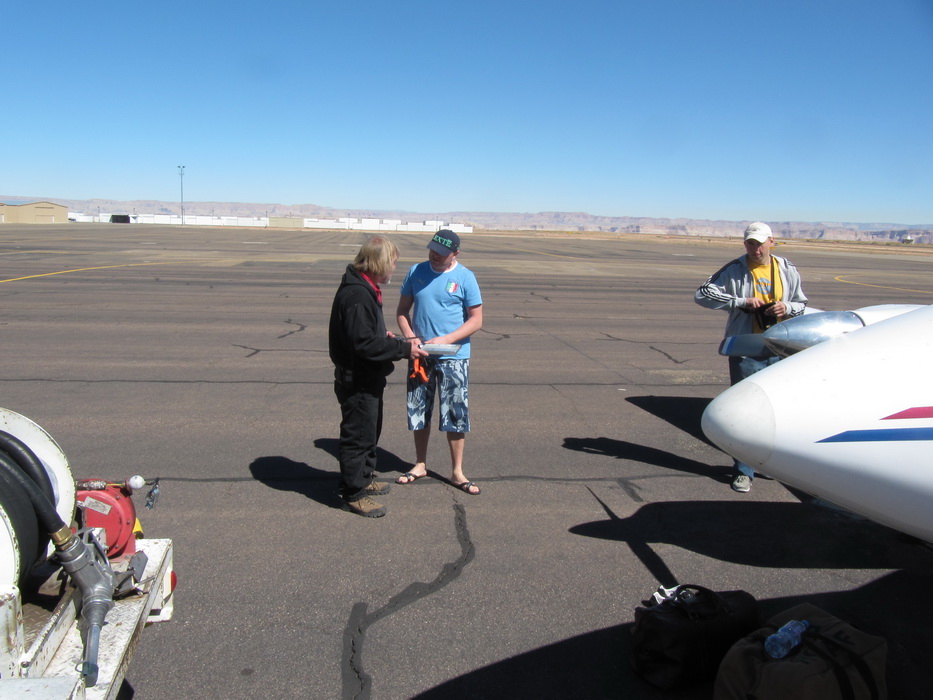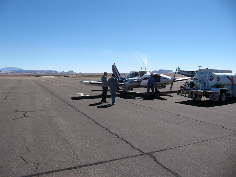 Еще накануне вечером, мы поинтересовались стоимостью топлива, услышав цену 4,95 за галлон, мы были удовлетворены. Когда мы были уже у самолета, к нам подошел мужиченка с внешностью рязанского пастуха и спросил , будем ли мы заправляться? Дима задал сакраментальный вопрос: Хау мач? Мужиченка невозмутимо ответил 5.00/галлон. Не в наших правилах было уступать 5 центов. Дима намекнул, что вчера нам озвучивали стоимость в 4,95 и обещали скидку от обьема. И вот тут мужичек сделал не правильный ход, он ведь не знал, что мы из России и не раз бывали в Турции, он спросил: А сколько вы будите брать? И тут как говориться,- Остапа понесло! Дима почувствовав слабину начал торговаться с усердием и упорством египетского продавца кальянов. Каждый цент, давался с боем. Мужиченка явно отступал, он вероятно не ожидал такой агрессии, а четкого прейскуранта видимо на аэродроме не было. За ходом дебатов было тем более интересно наблюдать, учитывая, что у Димы в словарном запасе кроме «хау мач» было только ес и ноу… В итоге мы вроде заправились за 4,80. Мужиченка вытирая пот со лба заливал нам полные баки. На сегодня задача была прозаично проcта,- пролететь по направлению к Bryce Canyon далее к Monument Valley потом пересечь 9000-ный хребет в районе Albuquerkue, выйти в долину и максимально долго пролететь…