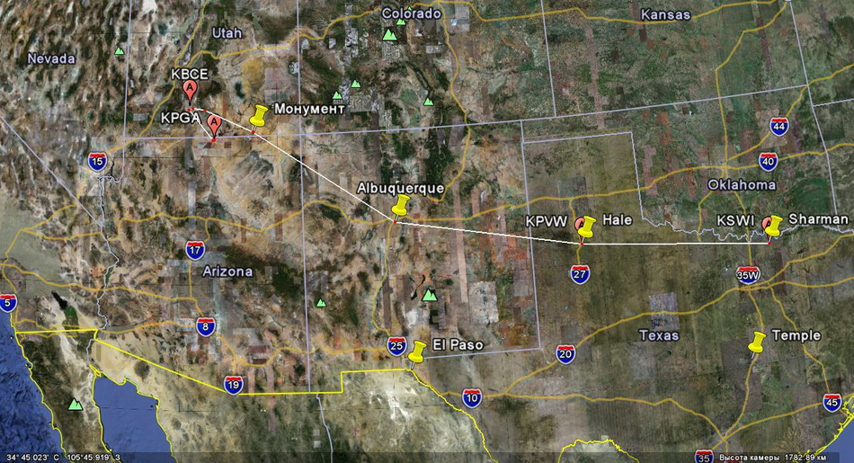 Пролетая непосредственно вблизи «монументов» наблюдали присутствие туристов и наличие частных посадочных полос. Сделав несколько виражей, помахали крыльями туристами и полетели дальше. Дальше нас ждал довольно-таки высокий хребет в районе Альбукерке, за ним начиналась долина. Самое ответственное,- перевалить хребет.