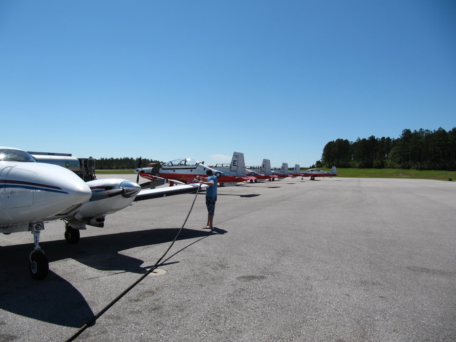 Дальнейшие процедуры не отличались разнообразием. Прибыв утром на аэродром , мы опять никого не встретили и так же инкогнито улетели, топливо нам не было необходимо. До Деленда было чуть меньше чем 6 часов полета. Топлива на борту оставалось на 5 часов, надо остановиться, пообедать и заправиться. Времени было целый воз, сегодня вечером мы планировали отправиться в Майами на арендованной машине. Предстоял легкий променад по югу штатов. Через три часа мы подходили к небольшому аэродрому с простым и запоминающимся названием Bay Minette. Судя по общению в эфире, аэродром был похож на улей , в котором летали пчелы. Доклады о вылете и заходе на посадку шли один за другим, но на кругу никого небыло, странно… Еще одна странность,- доклады на вылет шли сразу двумя курсами- 08 и 26. Ничего не понимая , я запросил, какая все же полоса активная? 8-я ответили мне и тут же доклад вылета с курсом 26. Первый раз в такой ситуации, что за бардак? Когда мы подходили к 4-му, и увидели взлетающий тренировочный турбопроп , стало все ясно- скоростные самолеты взлетали сразу двумя курсами и уходили на маршруты, к тому же присутствовали еще и военные вертолеты. В общем жизнь кипела. Зайдя на посадку, мы оказались в конце полосы, никаких рулежек небыло. Только полоса, с одно стороны ее была АЗС и административное здание, с другой ,- ремонтные ангары. Нам надо было к АЗС. Доложив руление по полосе, мы вальяжно проследовали к другому ее торцу. На парковке стояло несколько турбопропов US NAVY и пара вертолетов, судя по всему того же ведомства. Кругом суетились пилоты-курсанты . Персонал аэродрома Бай Минет состоял из семи молодых девушек,- наверное просто какя-то случайность... В здании , кругом висели их фотографии с курсантами. Нам предложили помощь в заправке самолета, но мы смущенно отказались, ну как вы себе представляете заправку которую будет производить девочка в мини шортиках, да еще с шлангом в руках?? Не, мы не такие…