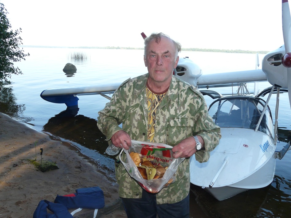Я не думал, что так близко от Москвы есть такие прекрасные места! Сосны, песок, прекрасный пляж, и ни души вокруг. Мы причалили и тесть слезая на берег, прямо у самолёта, сразу нашёл 3 белых гриба. В общем мы опять разошлись по интересам. Тесть за грибами, а я закинул удочку с ячейкой 40 мм. Пока я рыбачил, тесть познакомился с местной интеллигенцией. Люди в мае устанавливают на острове комфортабельные палаточные лагеря и всё лето приезжают туда на лодках каждые выходные как на дачу. Класс! Вроде и дача, но пахать там не надо. Грибы, ягоды, рыбалка, охота. На неделе там остаётся сторож. Он угостил нас самодельным ШАМПАНСКИМ ИЗ МАЛИНЫ. Вот это да! На будующий год слетаю туда и закажу себе этого напитка как можно больше. В общем классно провели время. Но всё хорошее когда-то кончается и мы стали собираться в обратный путь. Упаковали грибы и рыбу, сдутую лодку и уселись в Корвет. Но Корвет напрочь отказался покидать этот прекрасный остров. Ну ни как у меня не получалось вывести самолёт на редан. Промучавшись 20 минут, мы опять причалии и переложили багаж с носа в кабину. Попытка взлёта опять провалилась. Что случилось, я понять никак не мог. Звоню инструктору и прошу его помочь. Телефонные советы не помогли и инструктор отложив все дела бросился на помощь своему птенцу(утёнку)