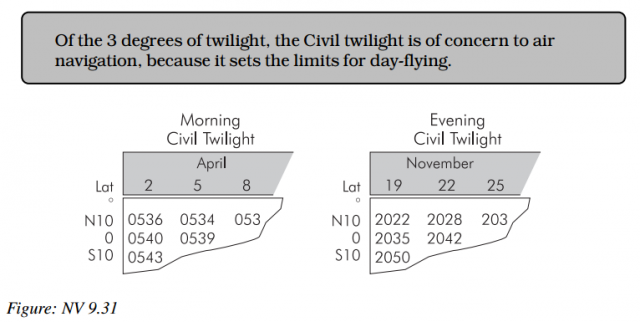 The first of these stages; the Civil Twilight, is the one we’re concerned with. A table in exactly the same form as the sunrise and sunset table has been worked out, so that the LMT of end of evening civil twilight (EECT) and beginning of morning civil twilight (BMCT) can be obtained in the same way as the SR and SS.