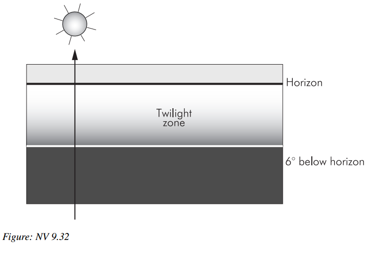 In the higher latitudes towards the North and South poles the Sun does not travel the shortest way through the zone and the period of twilight is much longer, so that the onset of daylight or darkness is far more gradual than in the tropics, as shown in figure NV 9.33.