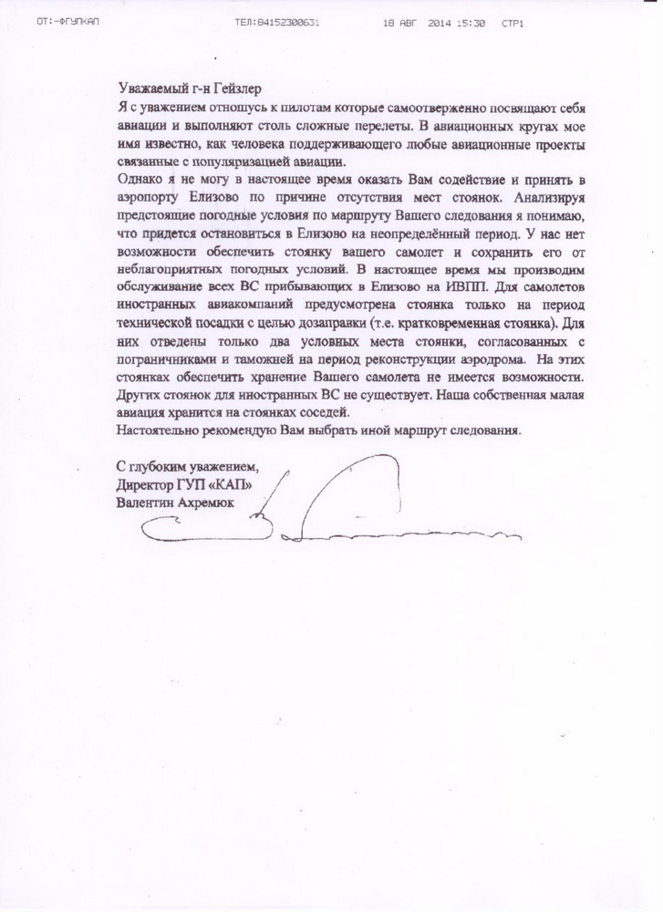 Не пустили. Он зато 3 года провел в Японии, освоил язык. Сейчас готовится погрузить свой ЛА в контейнер и отправить в Штаты. А оттуда продолжать дальше лететь: