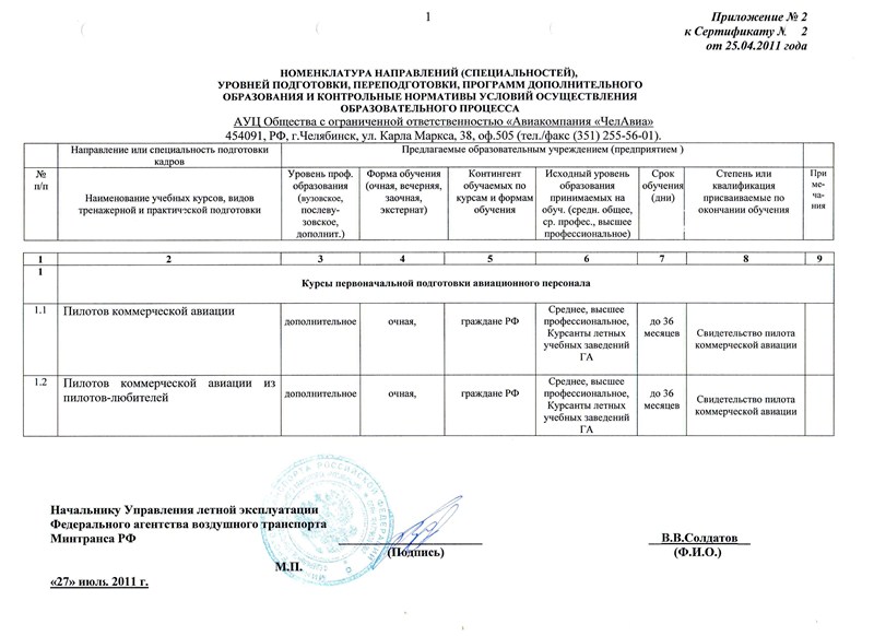 На основании вышеизложенного АУЦ ООО "Авиакомпания "ЧЕЛАВИА" совместно с ГОУ ВПО "Южно-Уральский государственный университет" + "Уральский учебно-тренировочный центр гражданской авиации" проводит обучение по программам подготовки пилотов коммерческой авиации кандидатов из числа выпускников средних, высших технических учебных заведений с прохождением итоговой Государственной аттестации и выдачей диплома о профессиональной переподготовке по специальности «Летная эксплуатация летательных аппаратов».