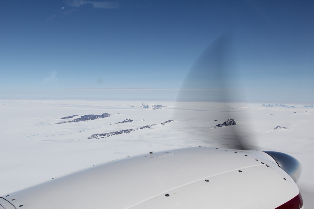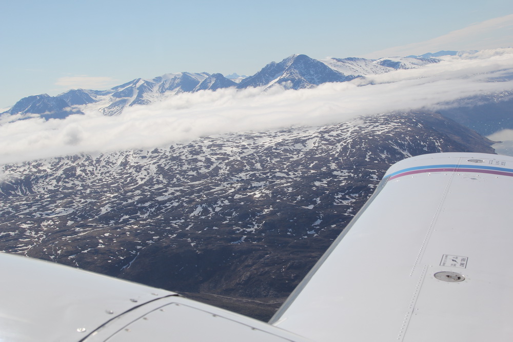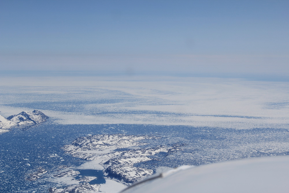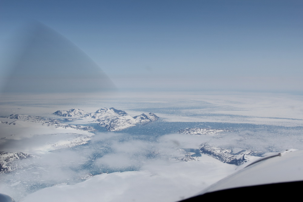 Цессна как раз зашла на посадку. Я сделал пару кадров аэродрома и приготовился глазеть по сторонам. Диспетчер предложил занять 13000, ага , с полной загрузкой... Это вряд ли , по крайней мере будем карабкаться оооочень долго. 11000-12000 самолет еще набирает но выше? После 10500 он еле ползет вверх. Только успев набрать высоту , му подошли к леднику. Светило солнышко, настроение отличное, облаков нет, я включил отопитель и приготовился наслаждаться полетом. Ледник действительно был красив , это как раз те места, где не ступала нога человека. До восточного побережья около 170 км.