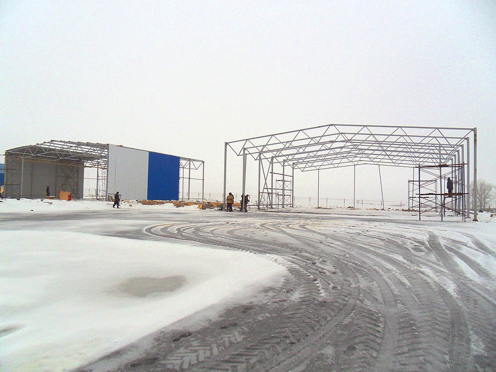 Погоды нынче стоят ужасные. Да и вопрос выбора ворот заставил несколько притормозить темпы стройки, ведь 18-метровые ворота - не пушинка. Они должны на чём-то висеть (а про опору створок на землю и зимние мучения уже выше красноречиво сказано). Таким образом, пока не будет ясности с силовой подсистемой ворот, не очень ясно, как надо (и надо ли) модифицировать конструкцию скелета ангара.