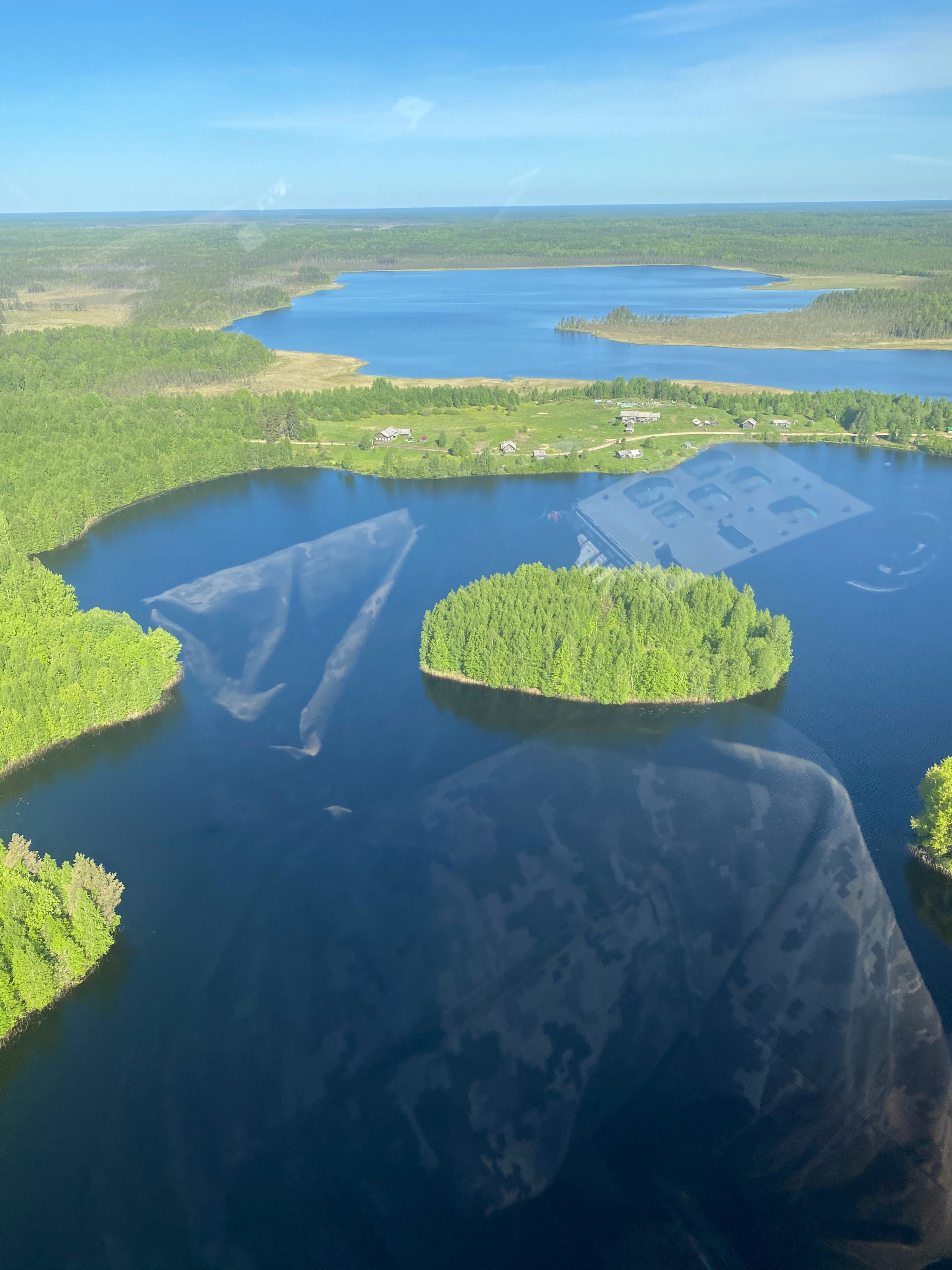 Только чуть дальше. На Вингозеро. Озёра соединяются протоками, так что в общем оно и есть. Всё очень быстро в Череповце и в 9.30мск мы уже на озере. Пролетели над западным берегом Кожозера и огорчились. :( Сколько же оказывается на озере избушек!!!! И точно не удочками ловят. :(